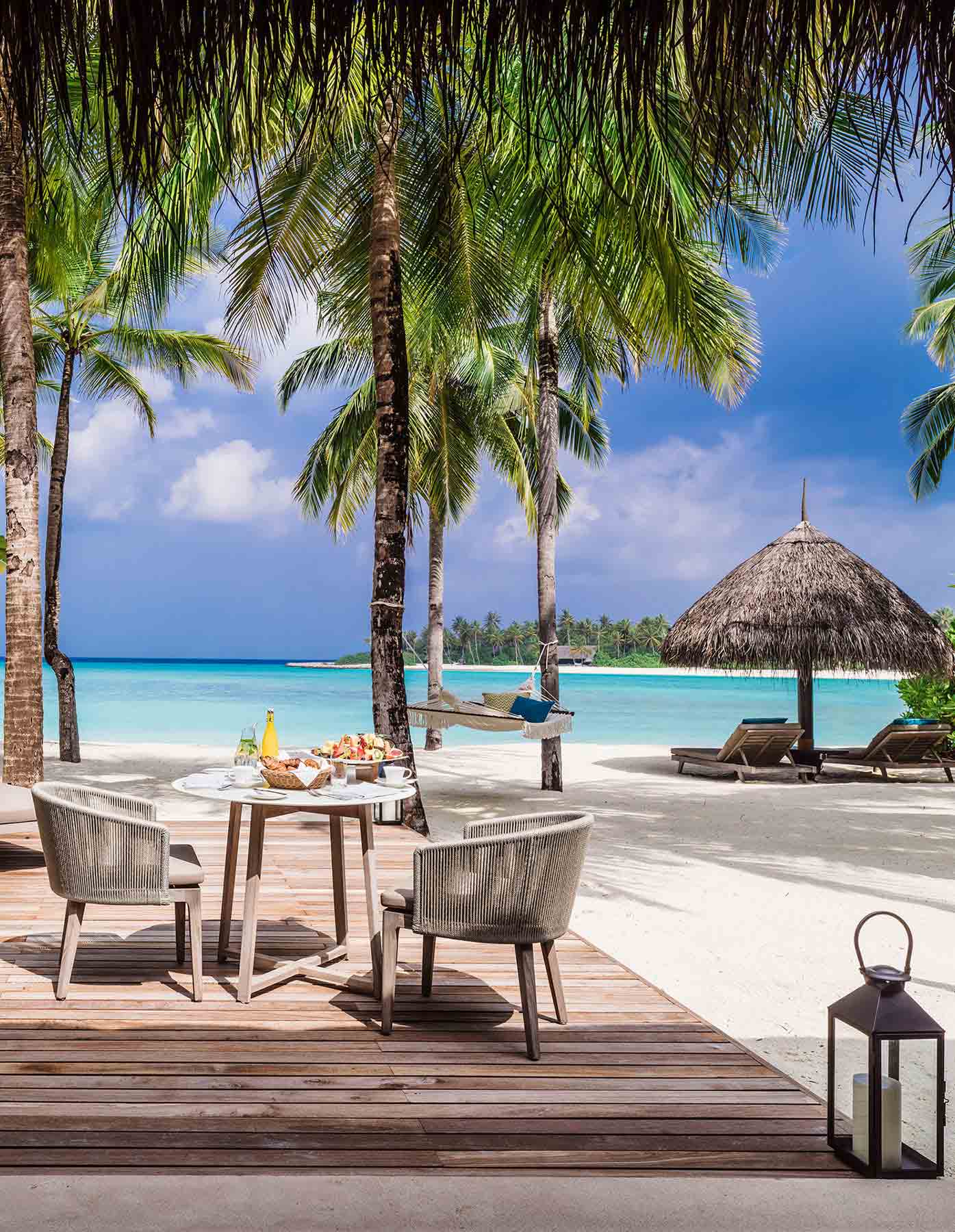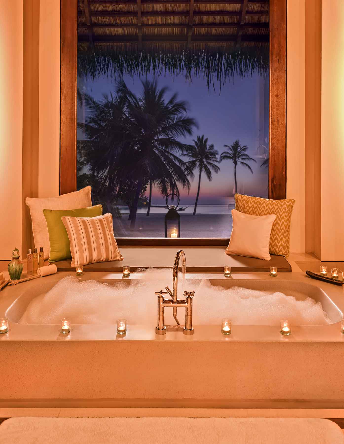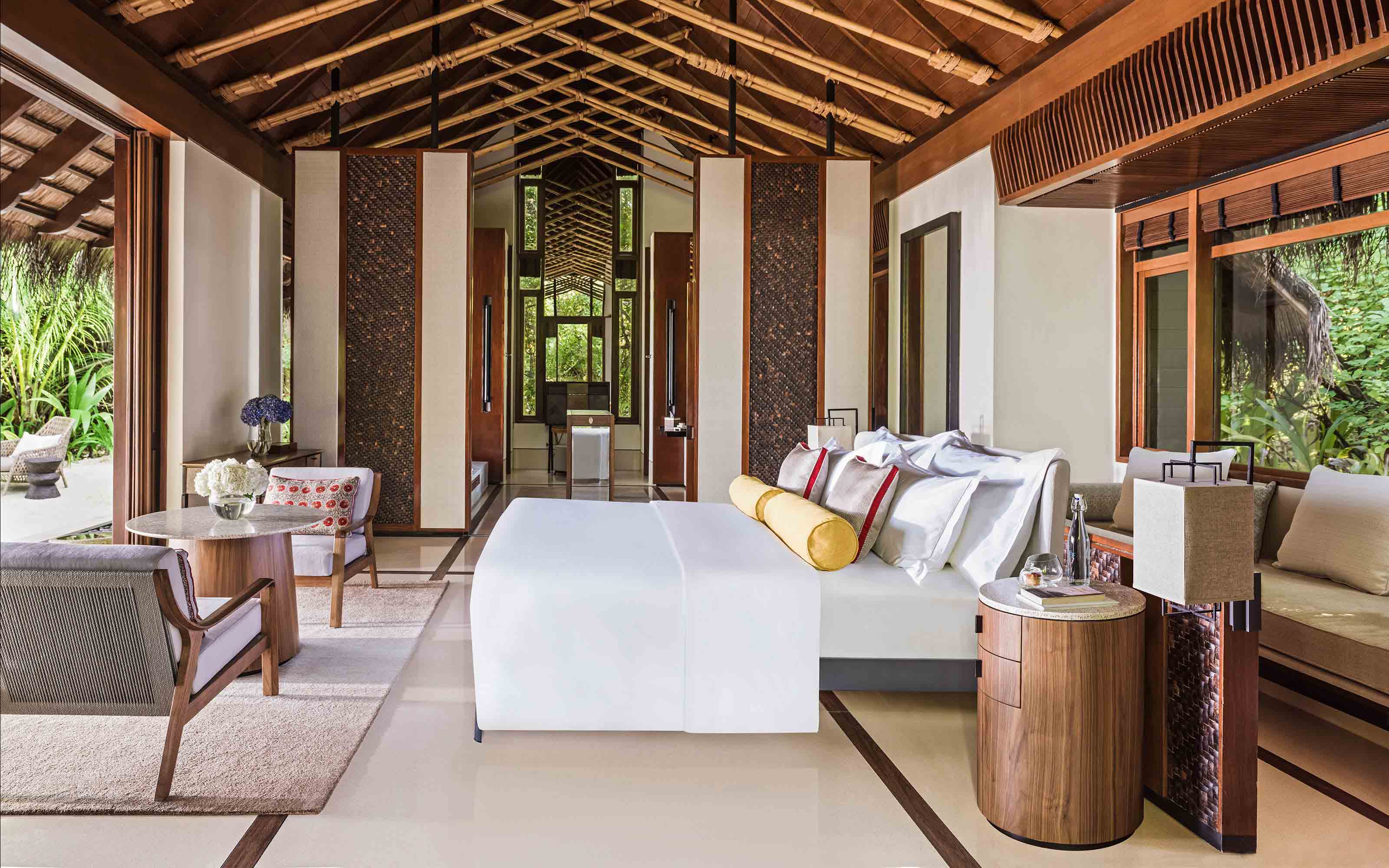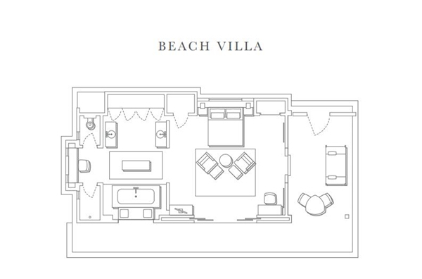 时尚的海滩别墅临海而建,散布在岛上的绿植之中,拥有无与伦比的私密空间。走廊提供灵活的外部生活空间,并设有风景如画的休息区、日光浴躺椅以及户外淋浴。室内装饰线条简洁,优雅而时尚,并辅之以超大浴缸和奢华淋浴。