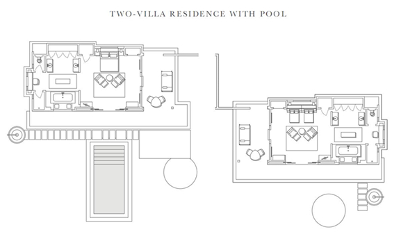 泳池双栋别墅与连通的海滩相接,仅相距数步之遥。其中别墅设有一张特大床,另一套设有两张大床,是家庭或团体旅行的完美选择。此外还附设阳台,以及面积为23平方米/248平方英尺的共用泳池和室外淋浴。