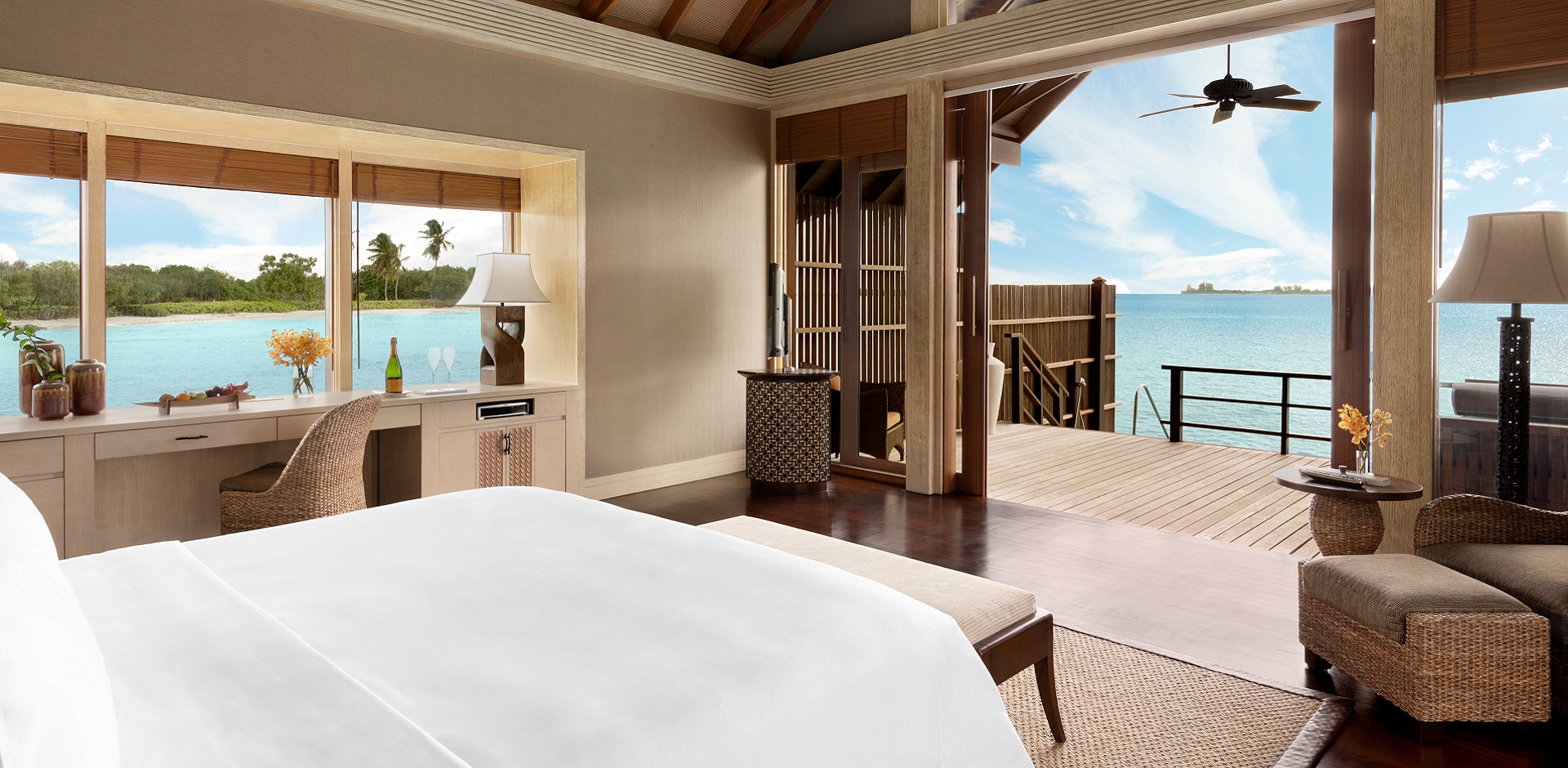 水上别墅采用开放式设计,明亮通风。走出房间,你就可以投入碧蓝海洋的怀抱,探索无穷无尽的海洋奇观。
