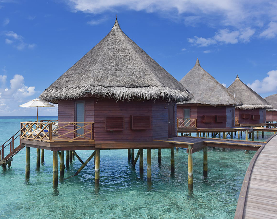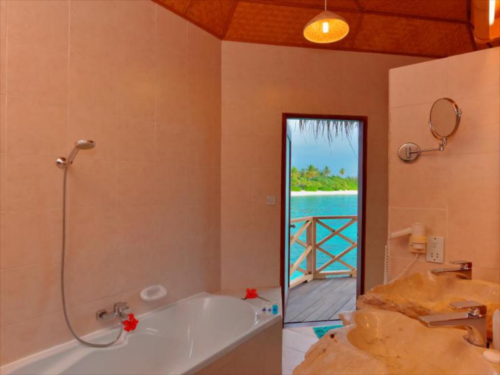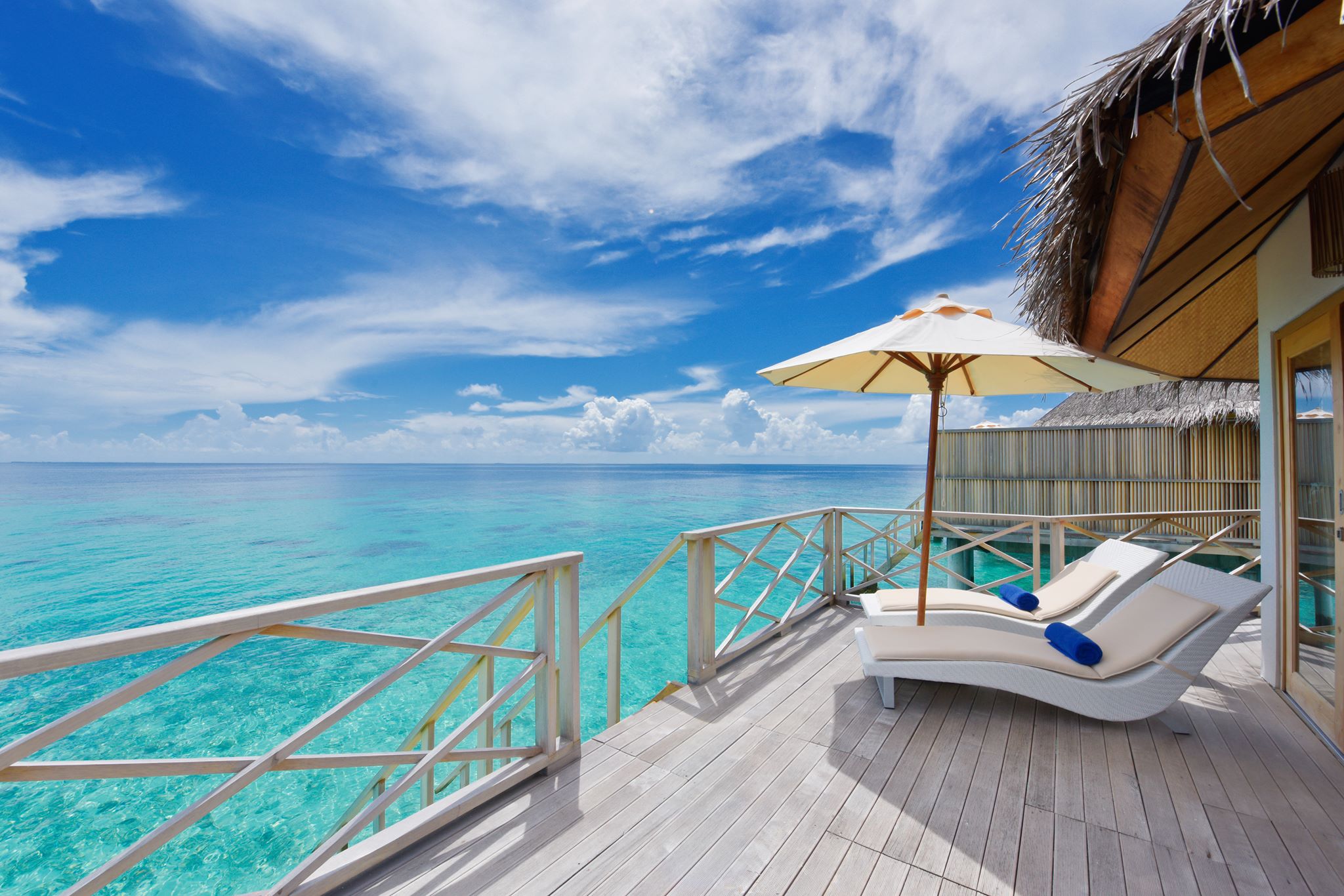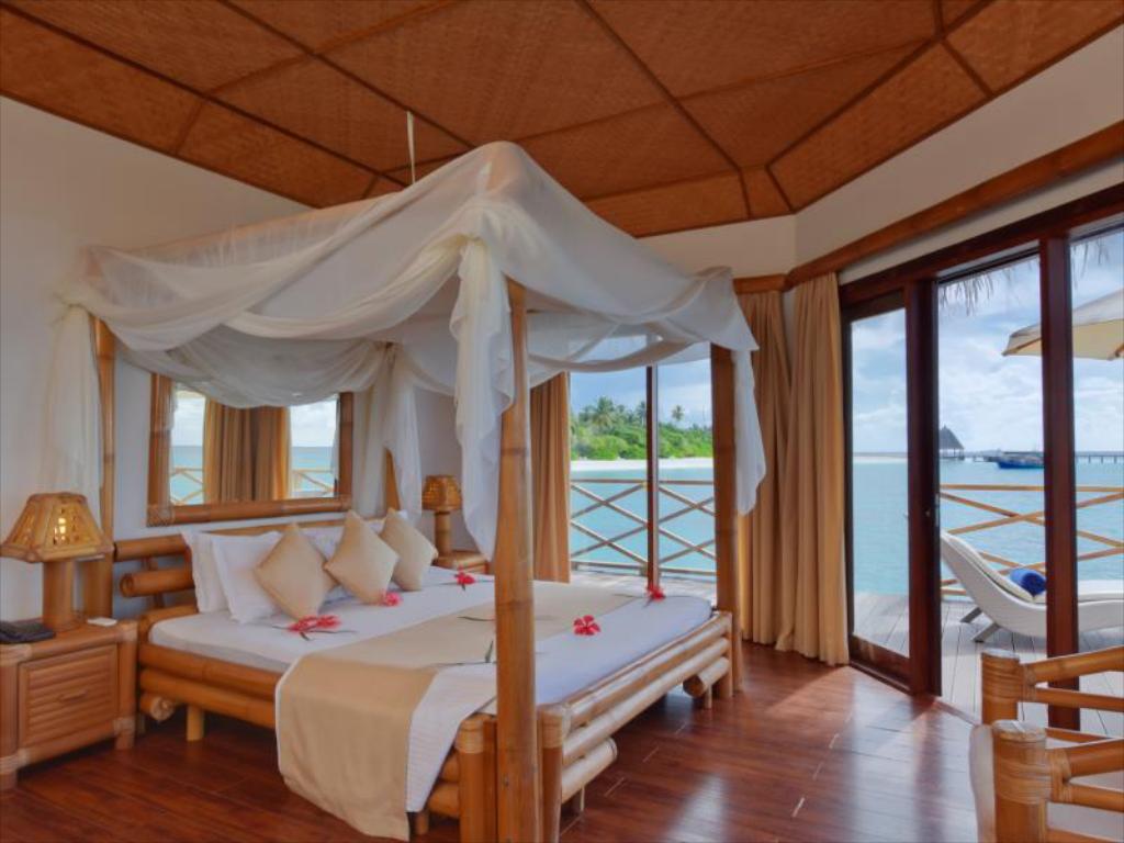 独立的水上屋有足够大的私人阳台,竹制的家具, 水上屋三面玻璃,打开帘子就享受外面的风景无敌,打开屋内的茶几玻璃可以直接喂鱼,在浴室的浴缸洗澡,打开朝向水台的门可欣赏美丽海景。