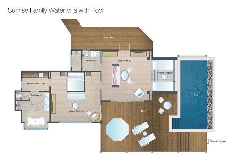 带泳池的家庭朝阳别墅设有两种露台供您选择,一种设有日光躺椅和通向礁湖的阶梯,另一种设有私人露台和室外泳池淋浴间。
