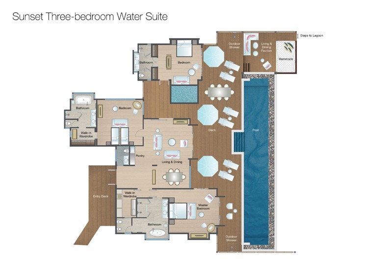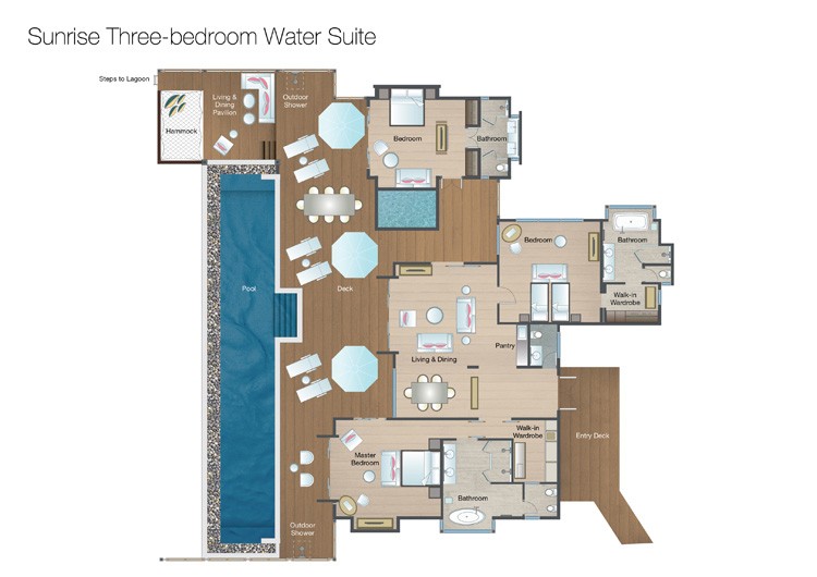 三卧室水上别墅房型面积很大,非常霸气,也分日落和日出两种朝向。可以查看下面的楼层平面图,泳池在左边的就是日出朝向的,泳池在右边的是日落朝向的房间。
