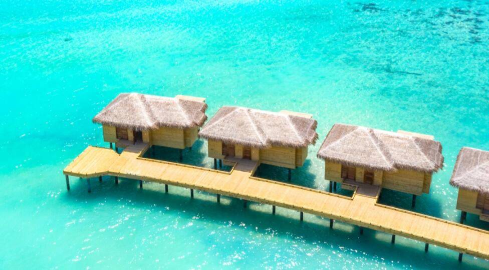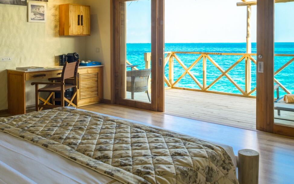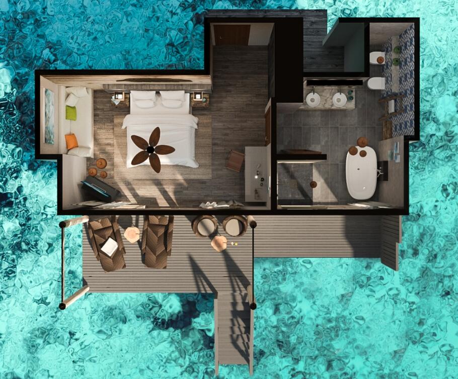水上套房铺设抛光木质地板,设有花洒淋浴和双人浴缸的大浴室,可远眺大海的超大床,沙发,可供您放松身心、享受日光浴、观赏壮观日出的大型户外甲板。