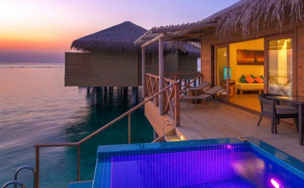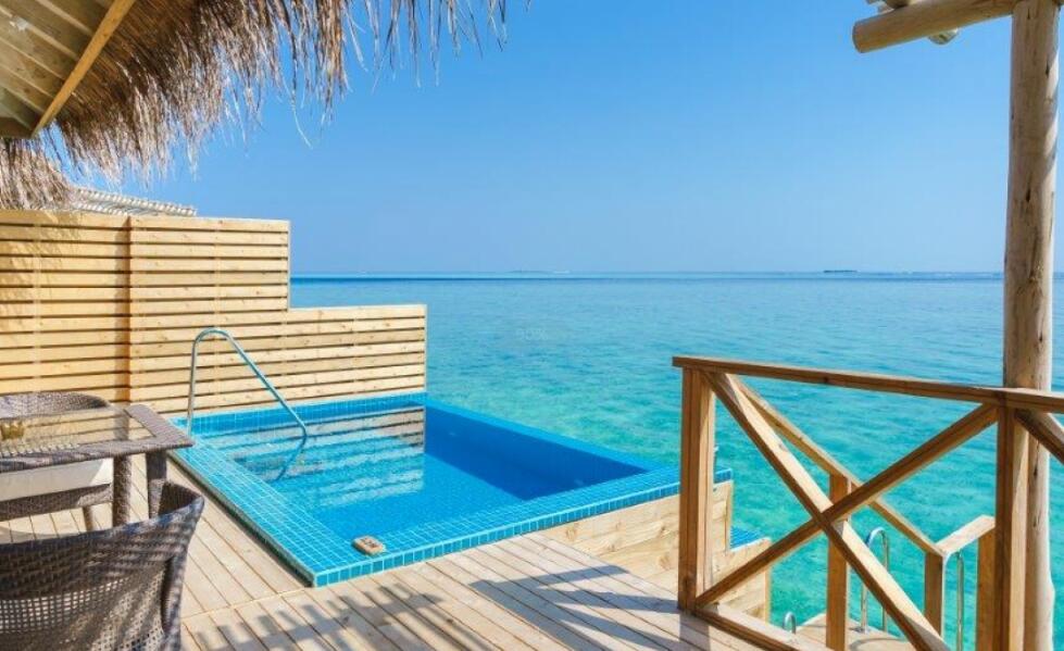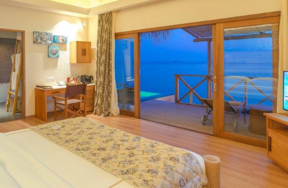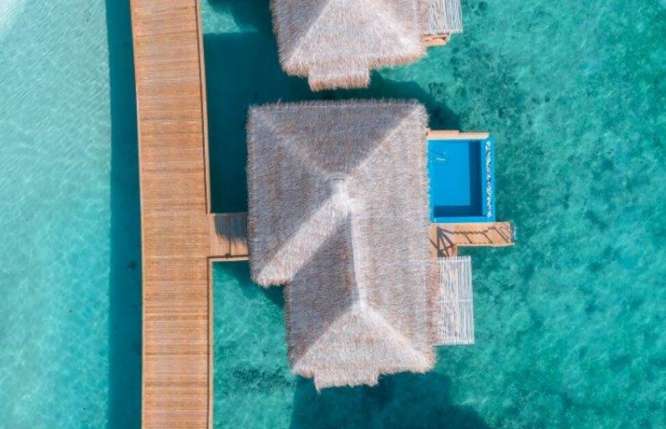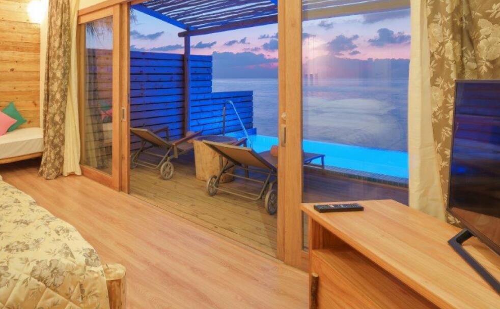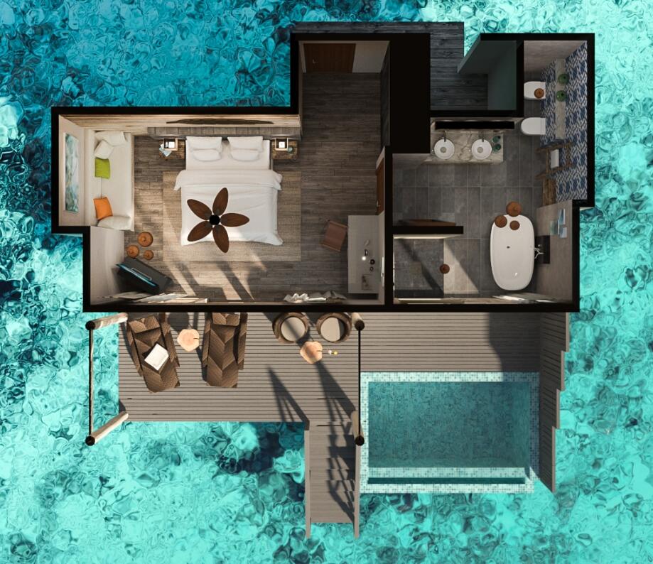 您可在水上泳池套房观赏令人惊叹的日落美景,套房设有无边私人泳池、大型日光浴平台、泻湖通道,您还可畅游大海。房间铺设抛光木质地板,配有沙发、带花洒淋浴和双人浴缸的大浴室。您可在此观赏大海的无限风光。