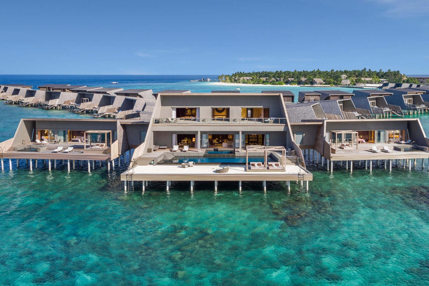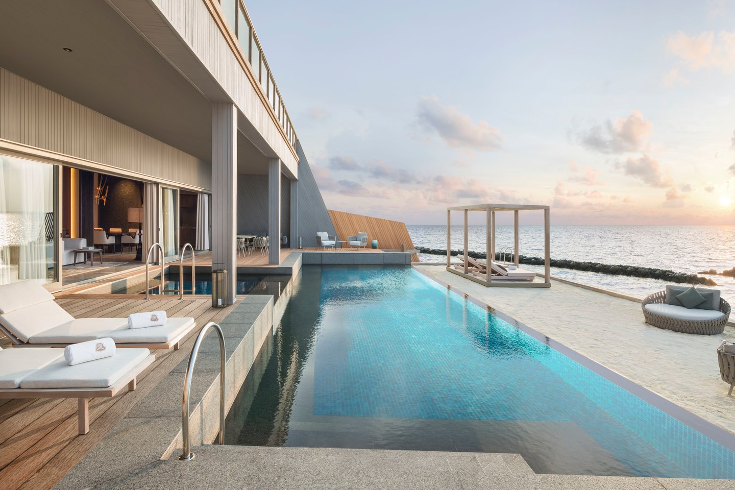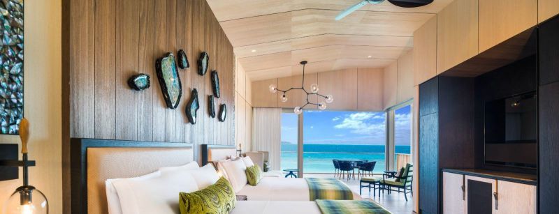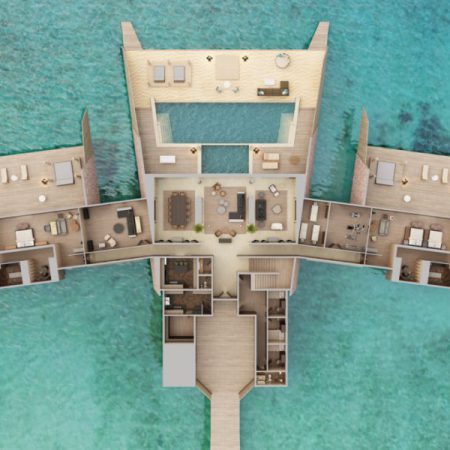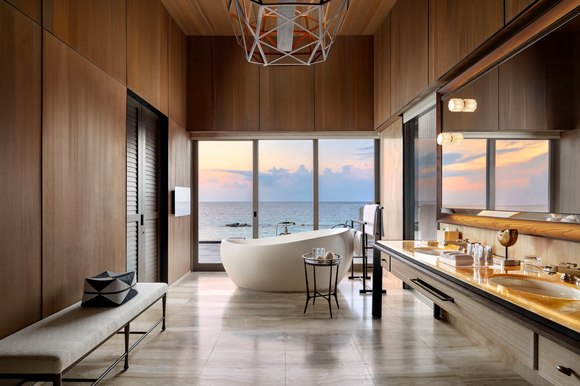 两个卧室一个配有一张特大号床,一个配有两个大床。每间卧室均拥有精致的起居空间,可直接通往带家具的露台,私人无边游泳池和按摩浴缸,享有无边无际的海景。大理石浴室设有室内和室外淋浴,蒸汽浴室和spa室。