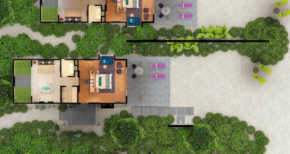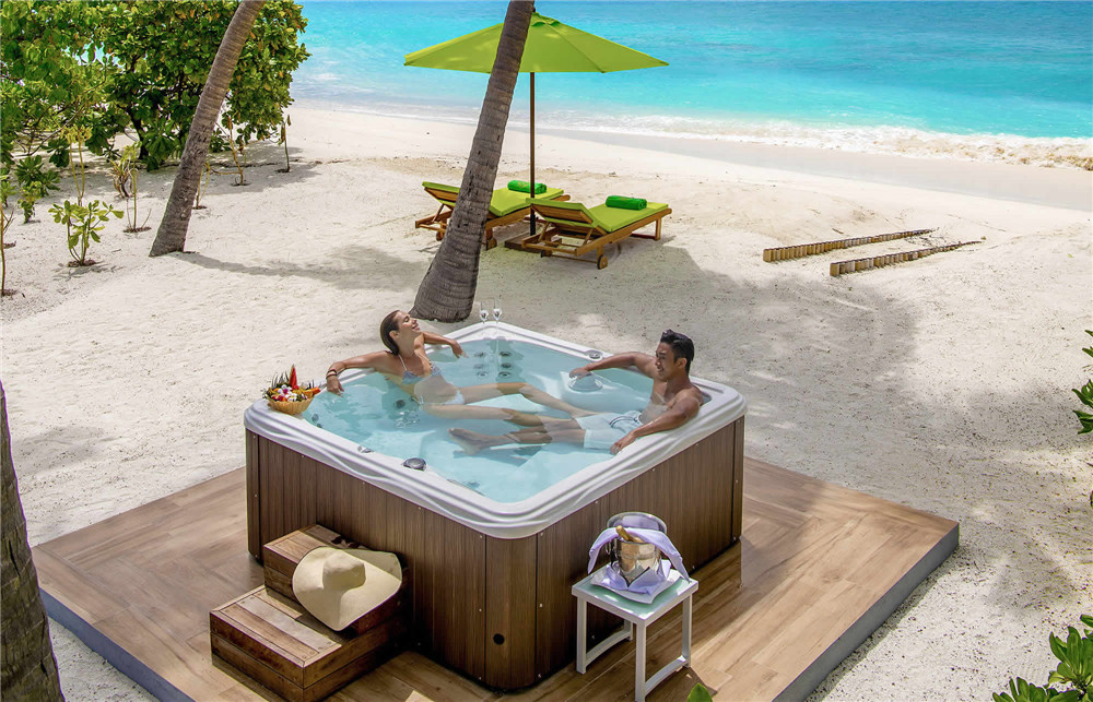 翡翠岛按摩池海滩别墅共4套。带室外卫生间及花园15平米,卫生间及衣帽间36平米,卧室40平米,阴凉庭院18平米,敞开庭院18平米,按摩池 2x2立方。别墅配有现代和现代时尚的家具。木质镶木地板位于海滩前方,距离珊瑚礁仅有几步之遥,私人庭院享有壮丽的海滩海景。
