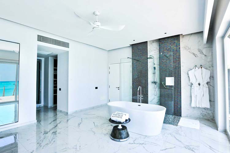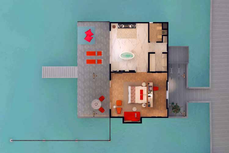 Water Villas酒店坐落在码头上,俯瞰着碧绿的海水,设有一间带浴室和步入式衣柜的卧室以及一个海上庭院。水上别墅共有25间,距离礁石仅几步之遥。私人庭院享有壮丽的海景,可直接从别墅进入大海。