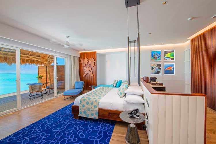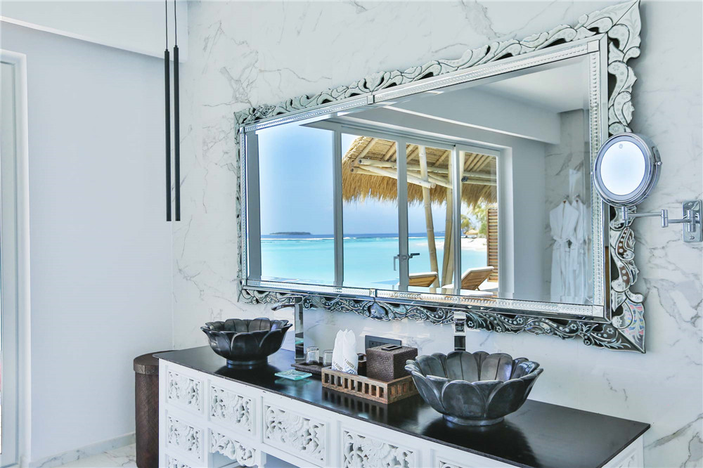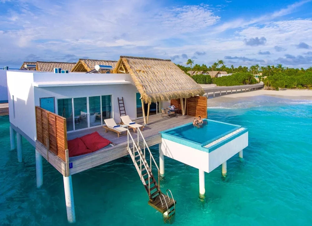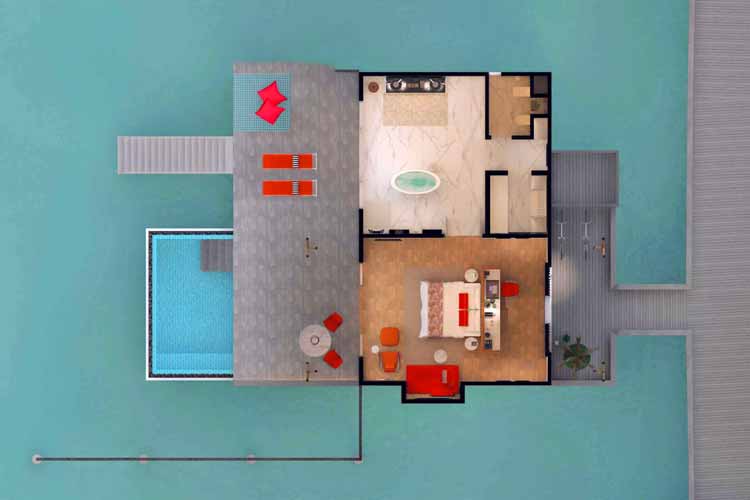 Water Villas with Pool酒店的卧室设有私人游泳池,浴室,步入式衣柜和俯瞰大海的庭院。海洋泳池别墅共28套,设有卫生间及衣帽间42平米,卧室38平米,庭院48平米,泳池5x3立方。