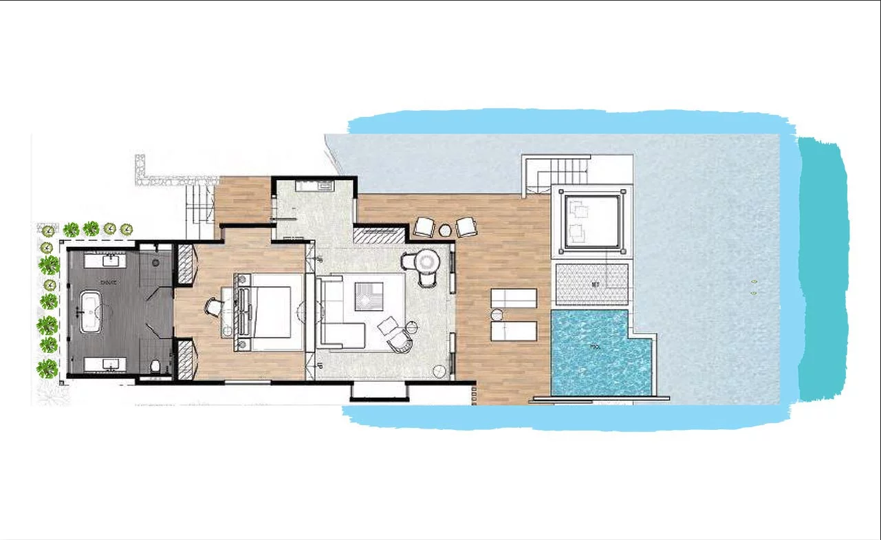 沙滩泳池别墅提供直接访问另外一个白色的私人沙滩,室外游泳池,木质的甲板,私家花园,开放式的起居室,宽敞带床的卧室。别墅还设有一个步入式衣柜,双水槽浴室,淋浴和浴缸,日光躺椅和甲板海景。