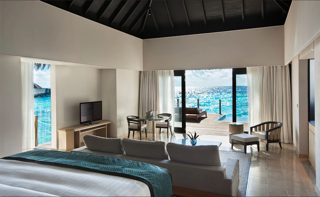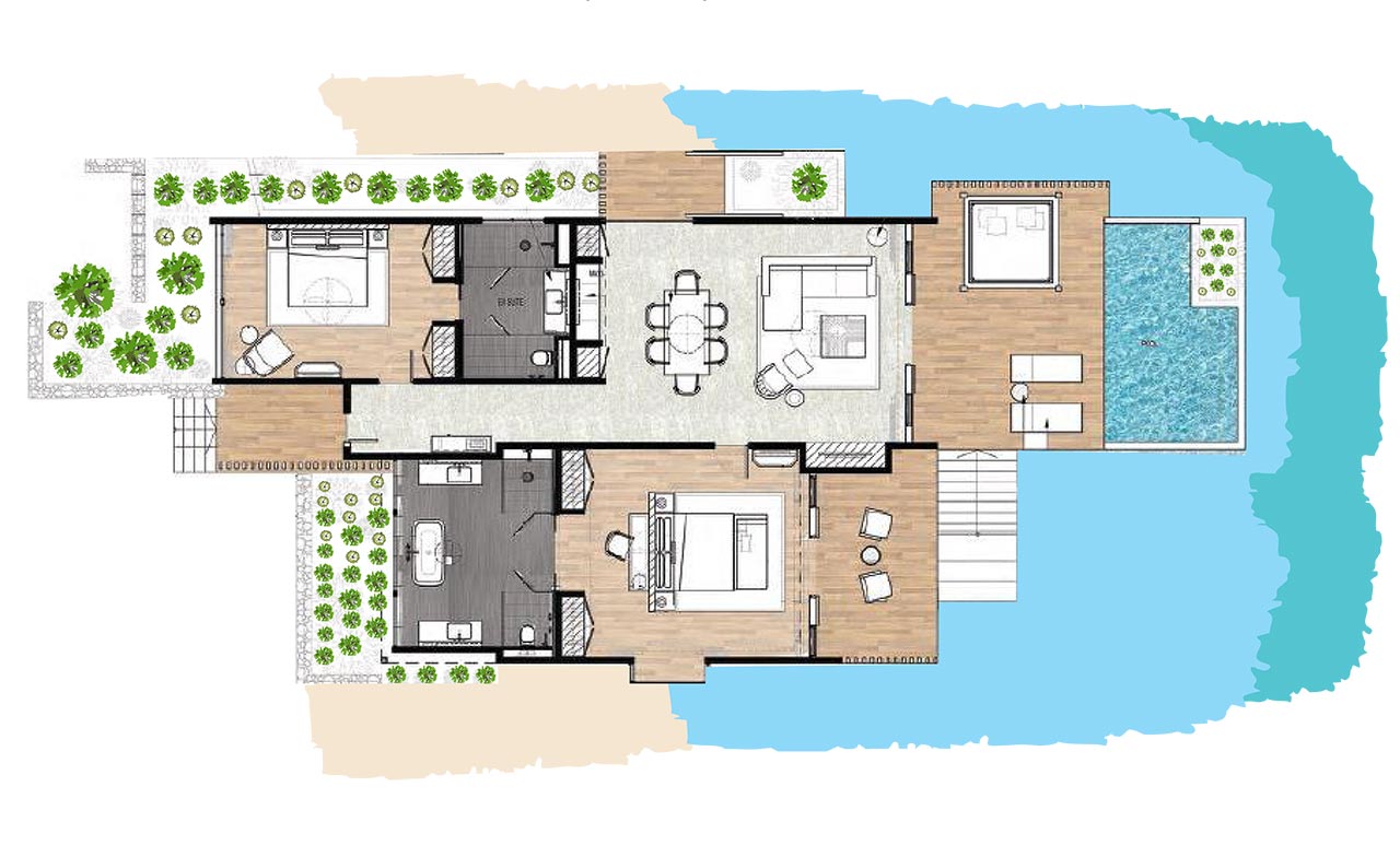 沙滩泳池别墅提供直接访问另外一个白色的私人沙滩,4.8米的室外游泳池,木质的甲板,私家花园,开放式的起居室,宽敞带床的卧室。别墅还设有一个步入式衣柜,双水槽浴室,淋浴和浴缸,日光躺椅和甲板海景。