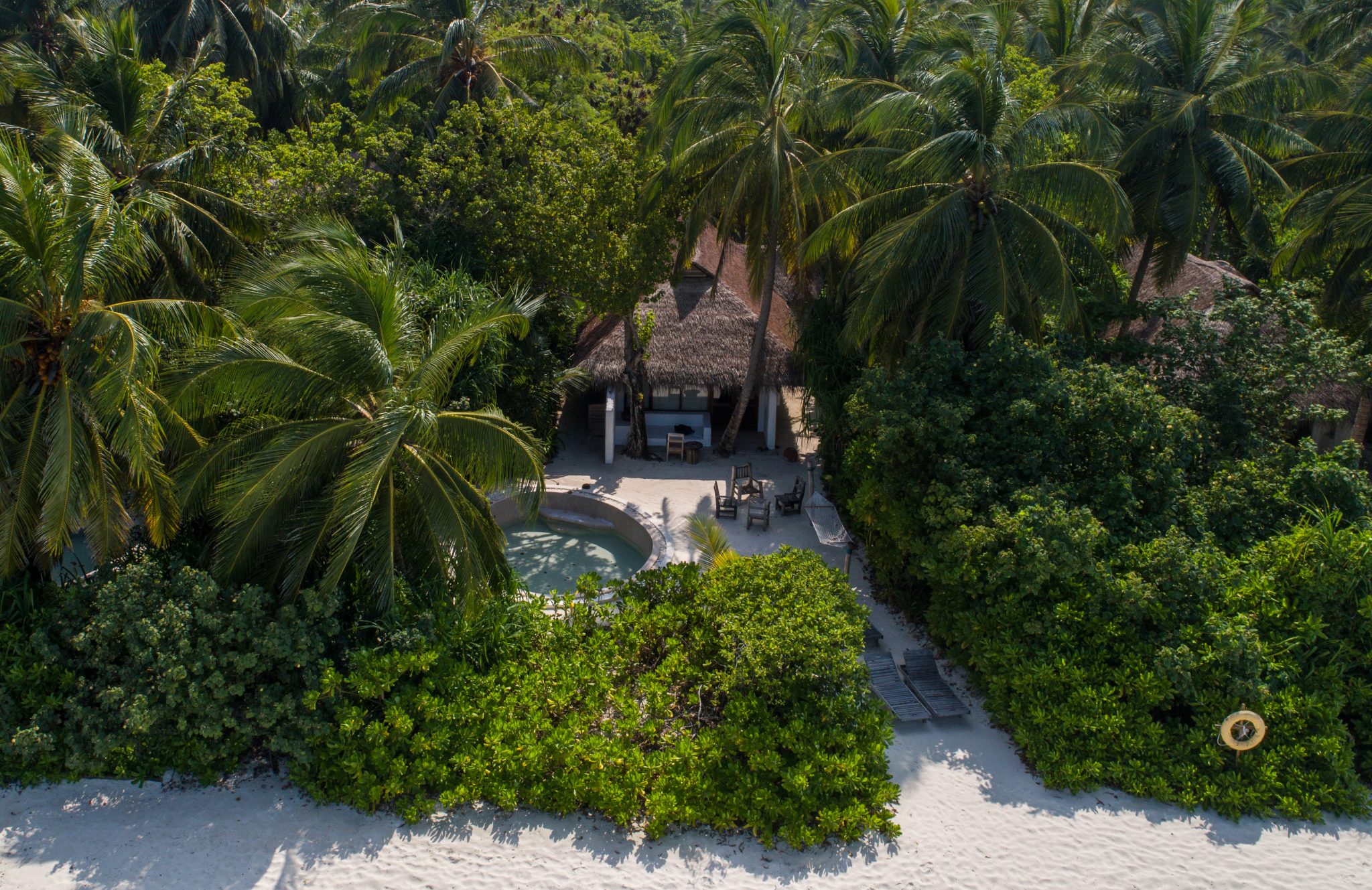 别墅套房建于沙滩之上,沿着游廊可到达一片温暖的沙滩。躺在舒适的四柱床上,透过起居室的落地窗,室外的美景尽收眼底,还可以在室外花园浴室尽情放松。