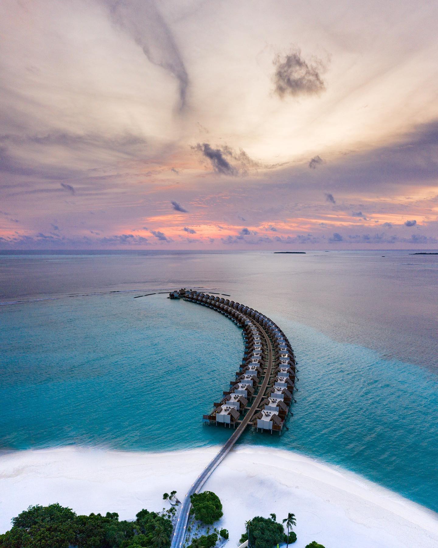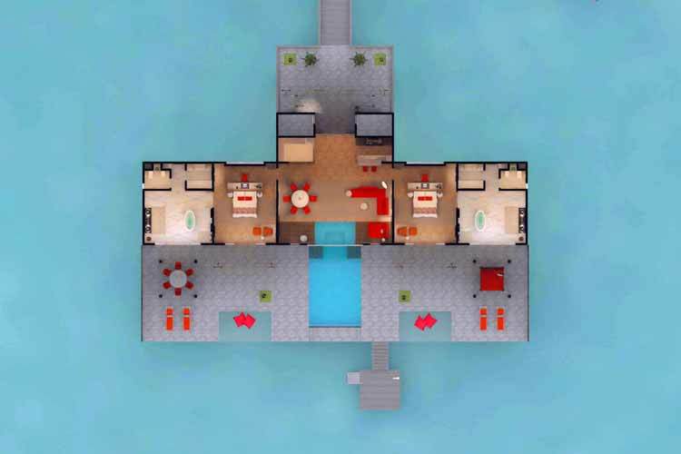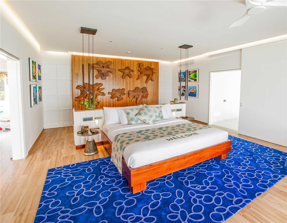 总统套房海洋别墅仅有一栋,是位于海上的宽敞别墅,面海的甲板上有着大泳池,两边各有遮阳休息亭,沿着甲板的楼梯往下,可步入泻湖中。这个别墅还配有吧台、厨房、私人管家室,带给你总统级别的尊贵体验。
