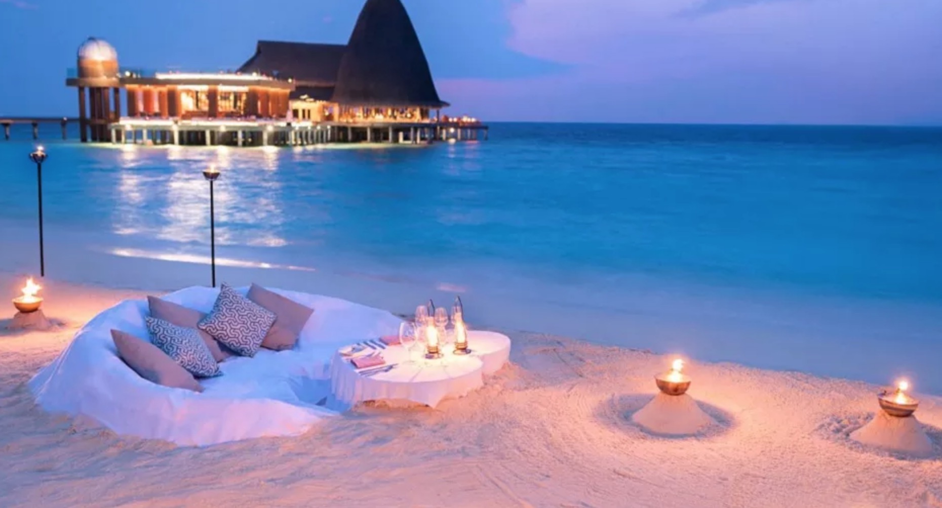 或在蓝天白云下,坐在沙滩上享受美食,布置优雅的餐桌旁,纯白色桌布在微风中游动。专业厨师选用最新鲜的当地有机食材,精心烹饪马尔代夫风味美食。