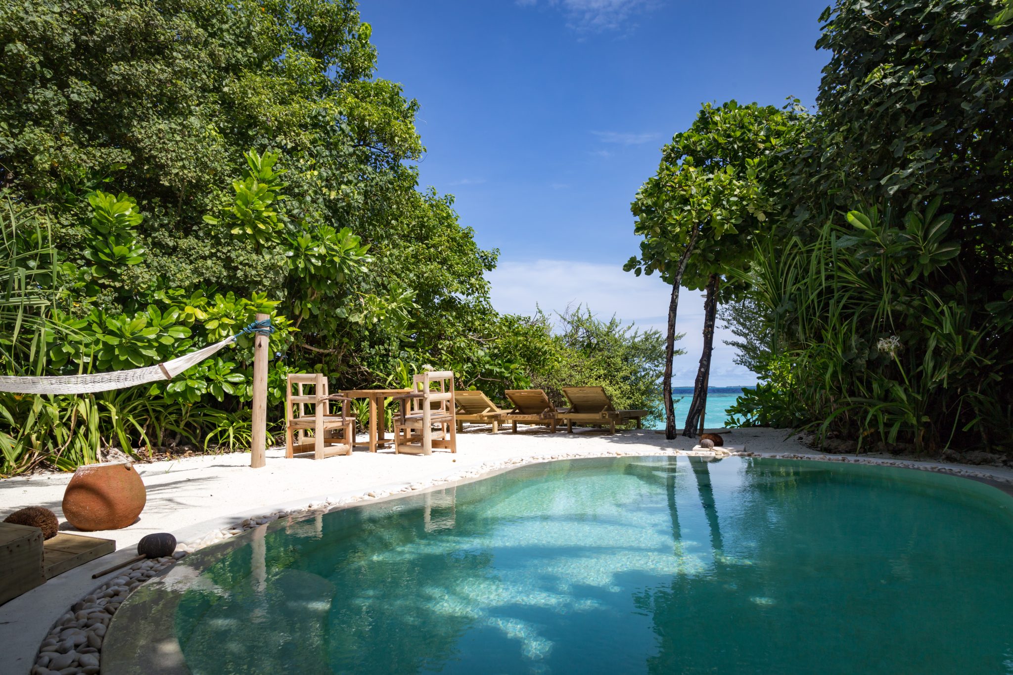 两个一楼卧室各自含有一个超大室外卫生间,卫生间都有天然瀑布,同时主卧室也配备有蒸汽设施的卫生间。跃入冷水池或私人泳池,然后去沙滩走走。在繁星缀满夜空时,体验夜晚的乐趣。慵懒的午后,则适合在电视休闲室消磨。这里距最佳的潜水地点和温暖的沙滩只有数步之遥。此别墅与42号别墅连通,构成一个9房别墅。