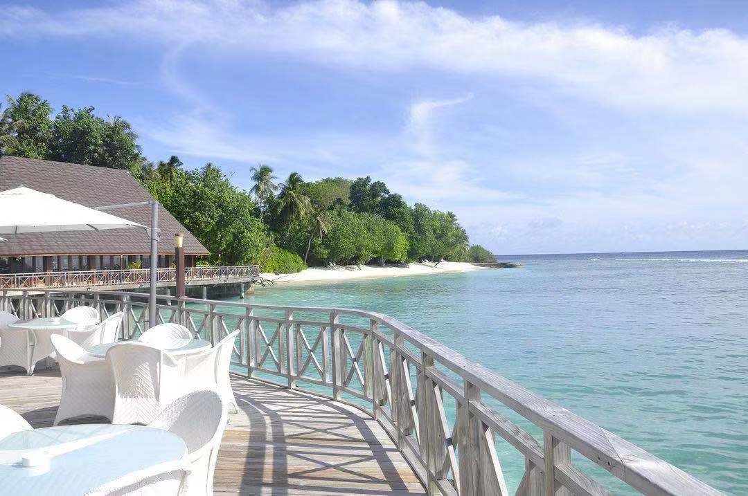 建在水岸边,有著宽大的水上露台,坐在上面,放眼望去水天相接。为全岛客人提供服务,这里24小时开放,提供各种餐饮选择,点菜服务如意大利面条或者印度咖喱等。
