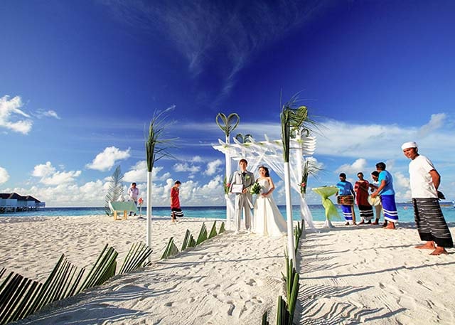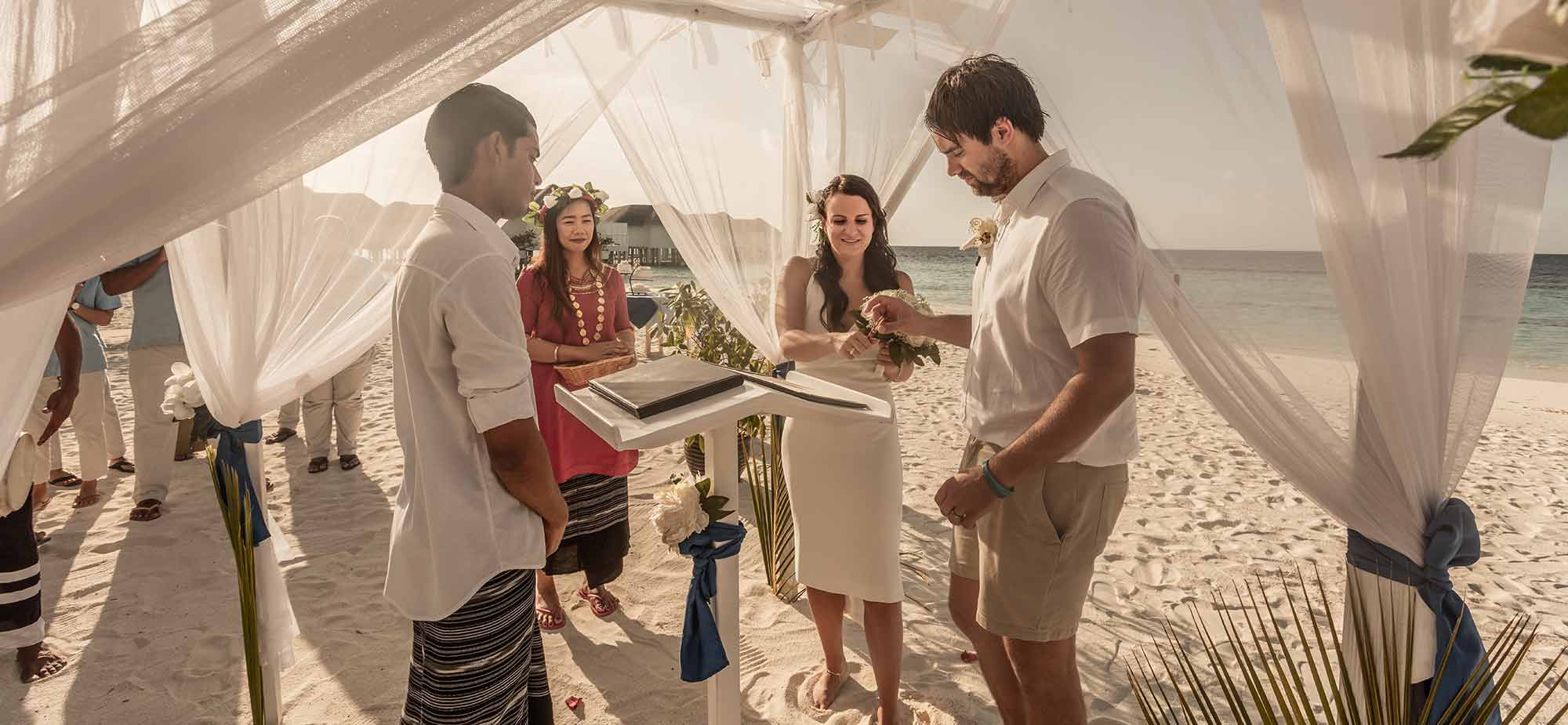 在原始海滩上交换誓言,传统的马尔代夫鼓声引领婚礼的进行。大自然提供了壮观的环境,几乎不需要额外的设计,每一刻都是完美的画面。婚礼仪式包括化妆和发型设计,婚礼摄影,婚礼蛋糕,花卉装饰,新娘花束和胸花。