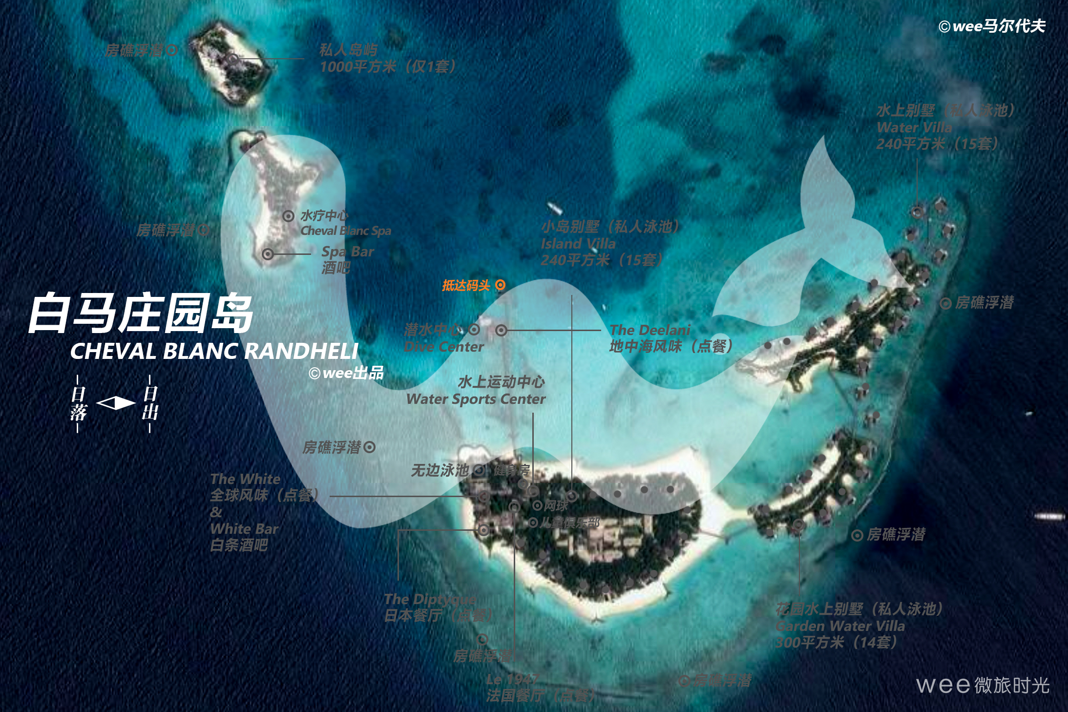 Cheval Blanc Randheli白马庄园上隶属于LV集团旗下的马尔代夫最奢华海岛。酒店的名字取自路易威登位于波尔多圣爱美隆地区的白马酒庄ChevalBlanc,由著名酒店设计师JaenMichelGathy操刀设计,是一家超豪华酒店。法国顶级米其林大师为客人烹饪每顿佳肴,各种顶级设施彰显无尽奢华。