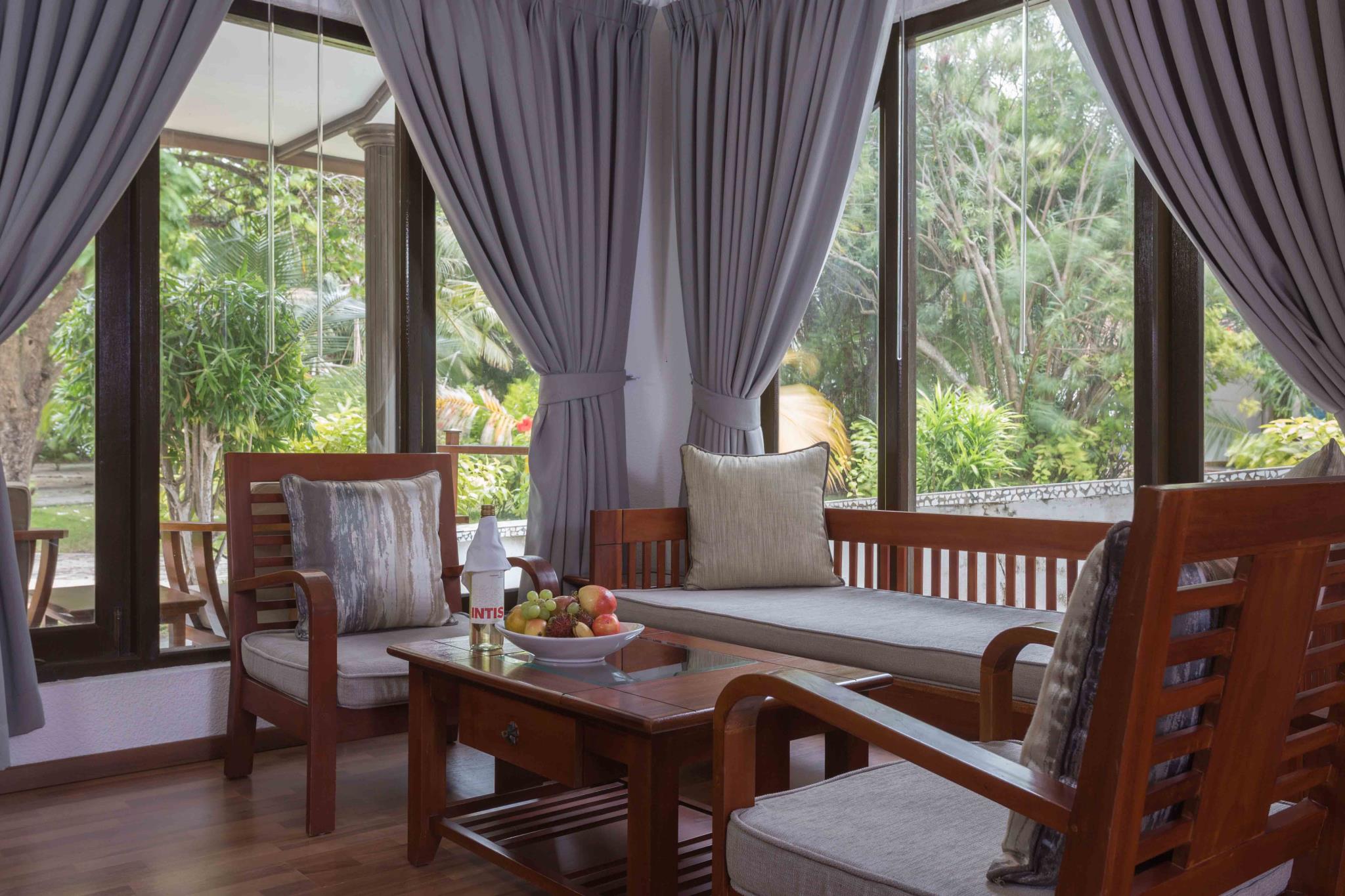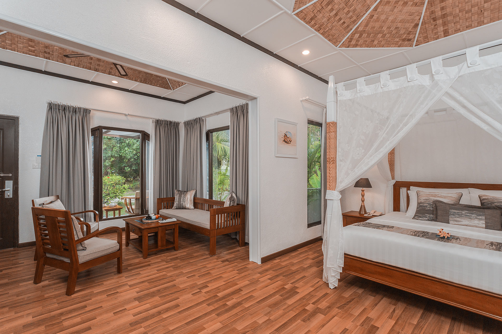 豪华客房布置精美,宽敞而温馨,提供豪华的休闲场所。明亮通风的客房面积超过54平方米,房间有落地窗户。大型四柱床,宽敞的浴室和乡土风格的设计体现了完美的岛屿度假。