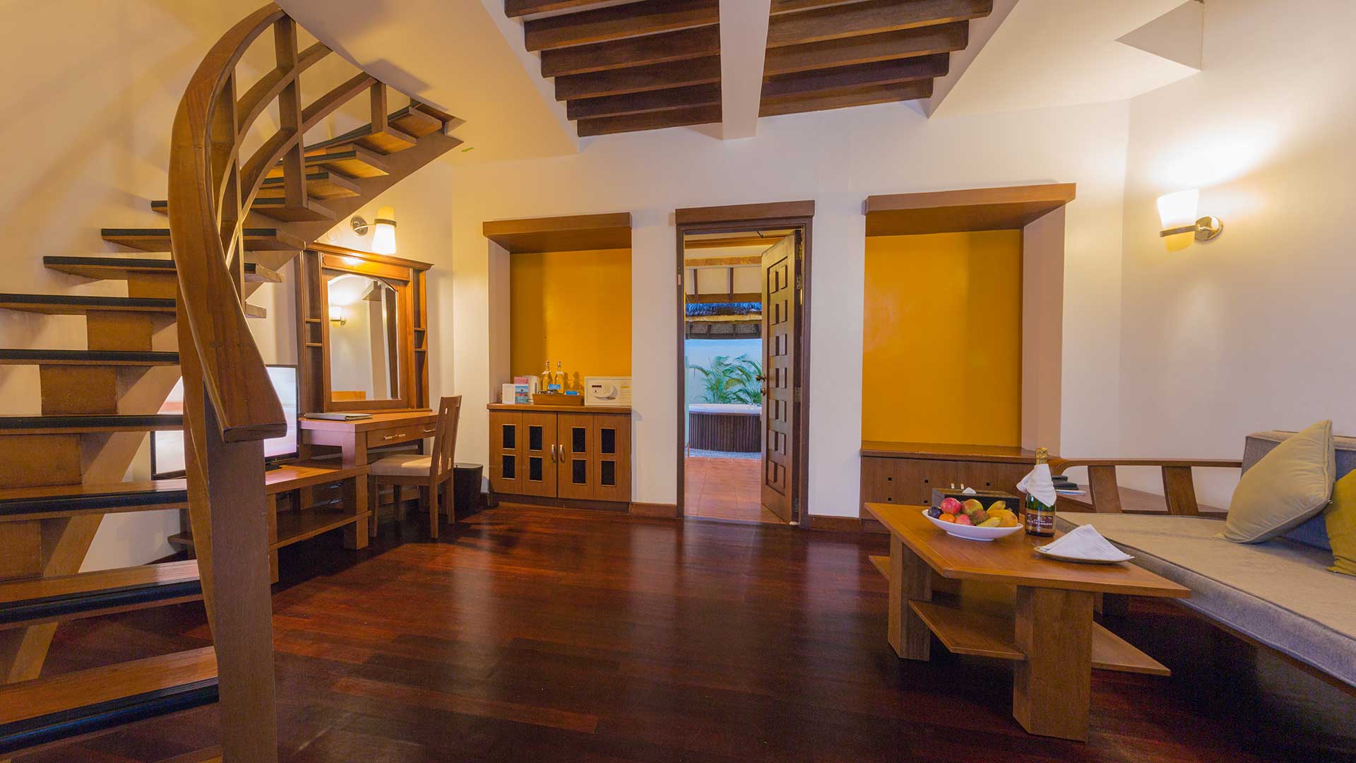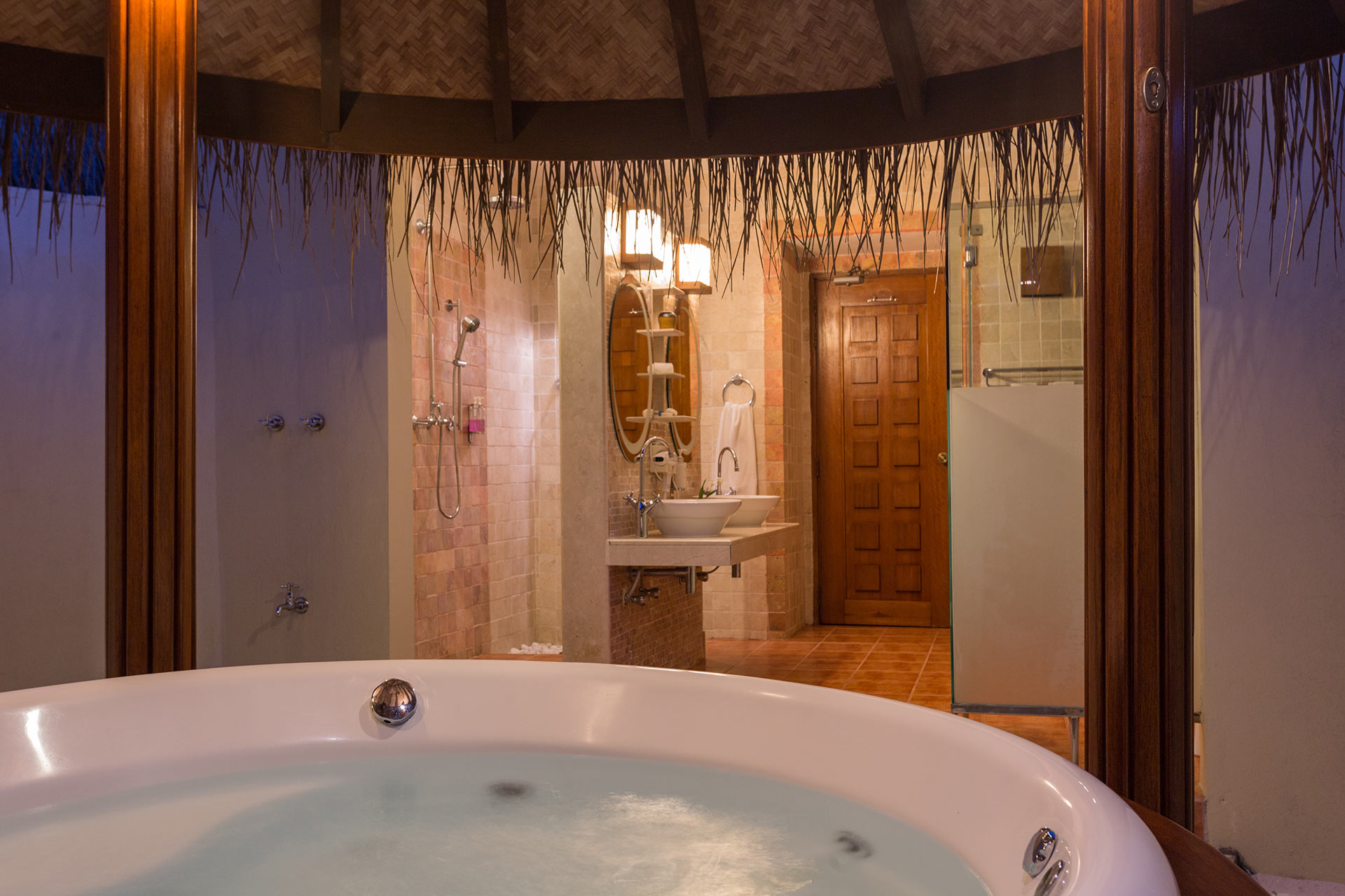 沙滩别墅Jacuzzi Beach Villa拥有传统的茅草屋顶和独立的起居和睡眠区,阳台享有迷人的海滩景色。沙滩别墅设有一个露天浴室,可以在拥有茅草屋顶阴影的露天喷射浴缸中放松身心。