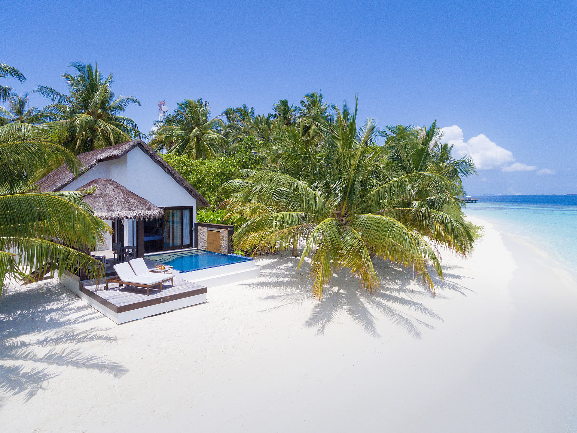 私人泳池别墅位于岛屿的边缘,提供豪华的现代化设施,享有壮观的海景。拥有的私人无边泳池延伸至波光粼粼的绿松石海浪,Cabana风格的阳光甲板让客户在隐居和舒适的环境中放松身心。Villa酒店内部拥有现代风格的装饰,配有一张特大号床和按摩浴缸。