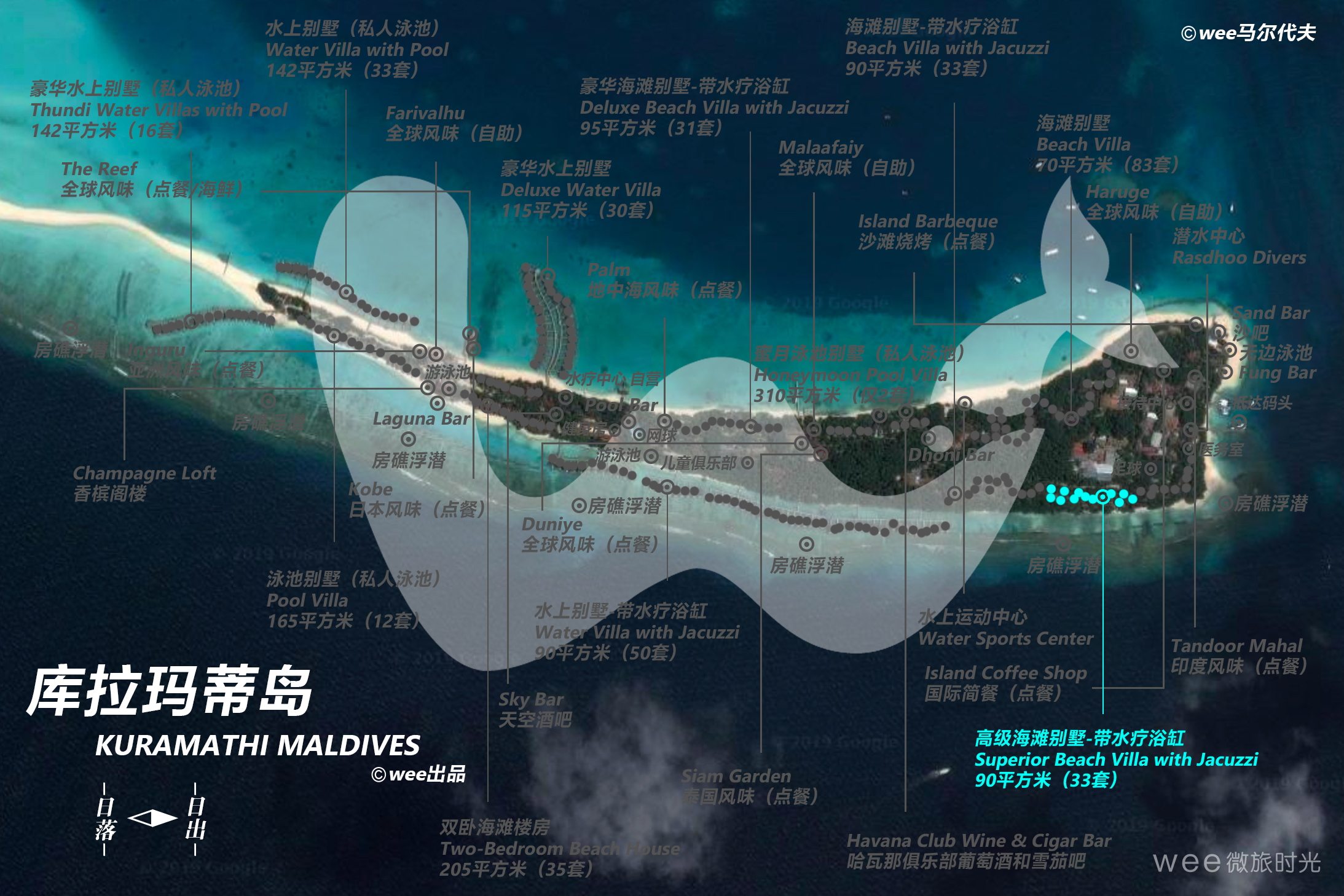 这些别墅拥有现代化的设计。别墅为圆形,设有木制甲板,拥有舒适的室外沙发床和躺椅。卧室宽敞而简约,以特大号床为中心,房内设施环形放置。露天浴室拥有一个户外按摩浴缸。