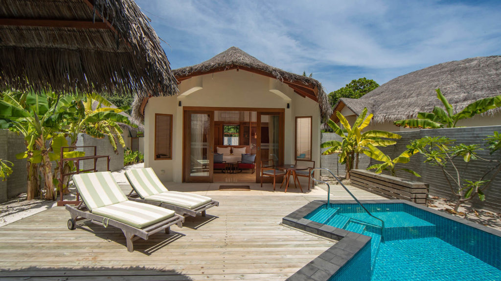 Dhoni Pool Villa 多尼泳池别墅 ,设计灵感来自传统的马尔代夫渔船“Dhoni”,坐落在白色沙滩边缘的植被中。