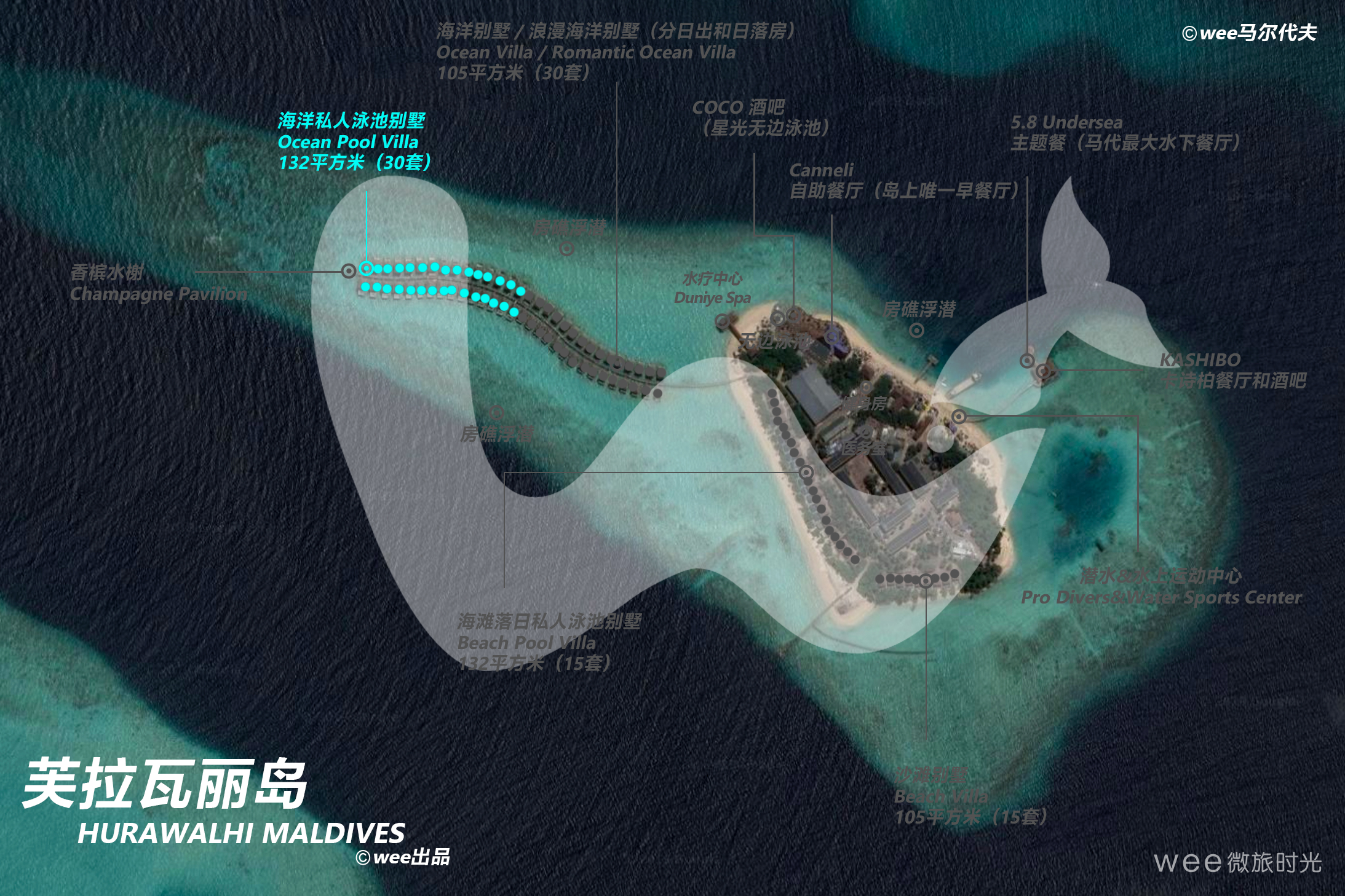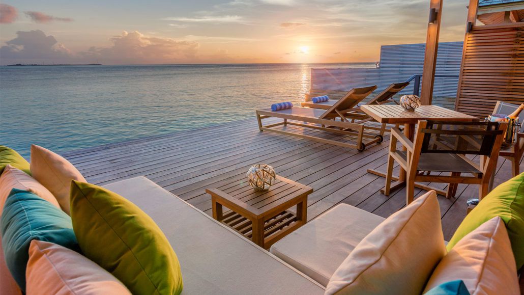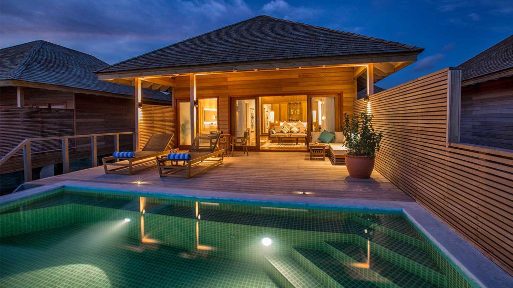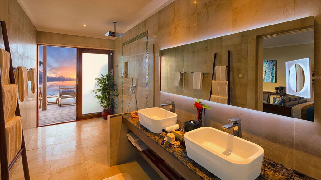 标志性的别墅勾画出完美的画面:宽敞别致的内部空间通向可直接步入美妙环礁湖的私人日光晒台,让你的思绪沉浸于专属的无边泳池。