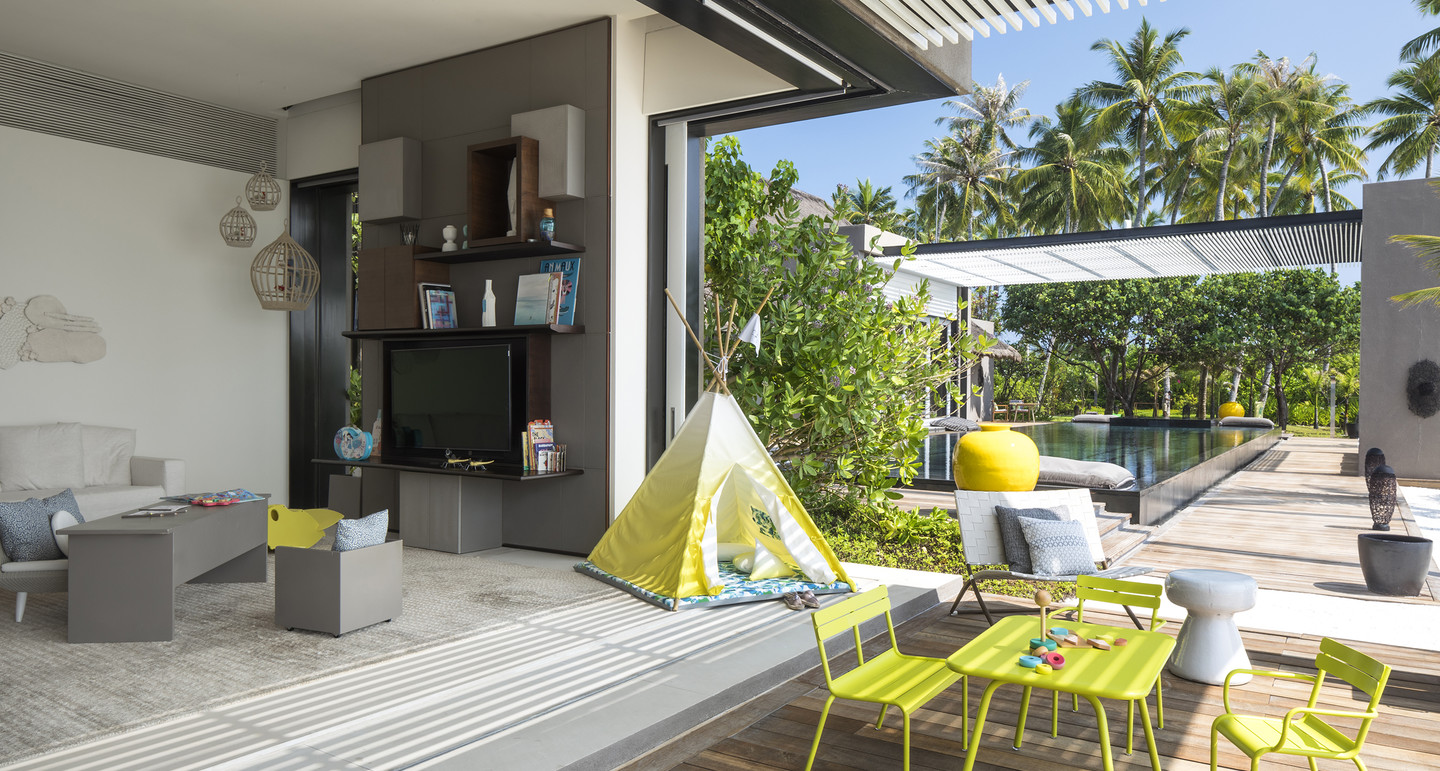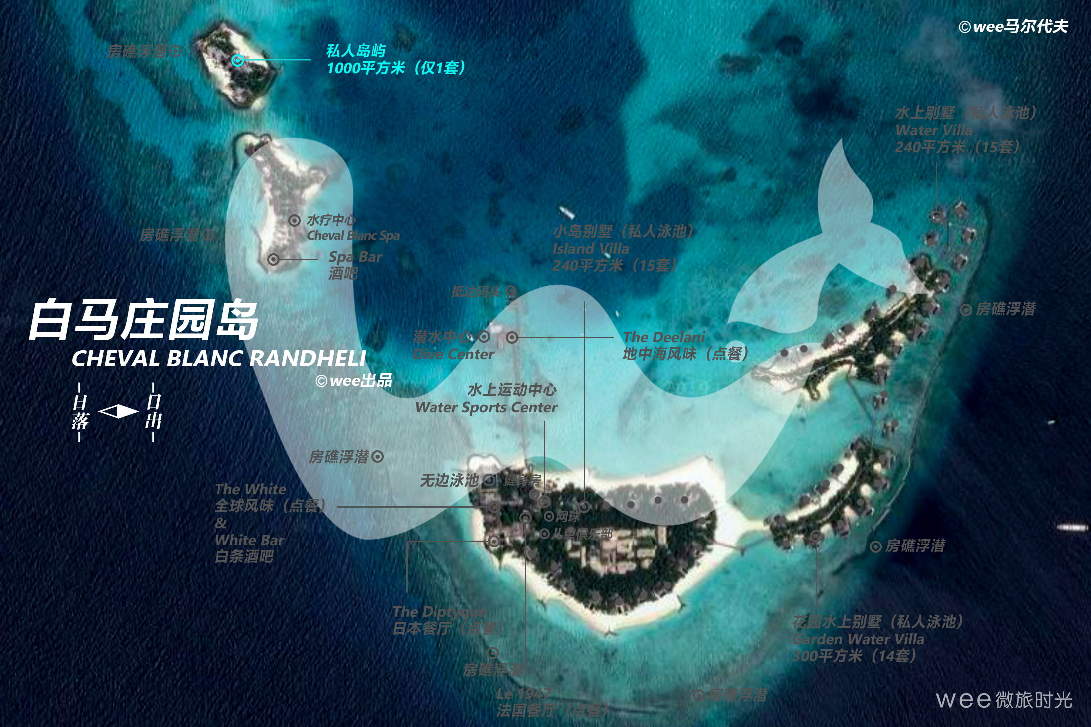 Cheval Blanc Randheli私人岛屿为一个面积约1公顷的专用岛屿,岛屿拥有泊位和码头。建有一栋四卧室别墅,占地面积超过1,000平方米,是豪华现代岛屿生活的实际体现,拥有独特的室内和室外空间,专业的Ambassadeurs团队以及一系列充满活力的定制服务和设施。