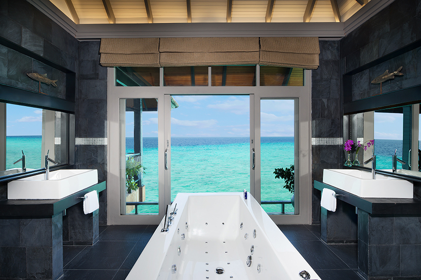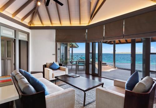 豪华水上双卧无边泳池套房坐落在栈桥的顶端,时尚而成熟、朴素而典雅的设计充满了独特的味道。在这里可以欣赏印度洋碧绿的海水和两个无人岛的广阔景致。可以直接进入泻湖,豪华起居区设有落地木门,可通往迷人的无边泳池和室外日光浴平台。