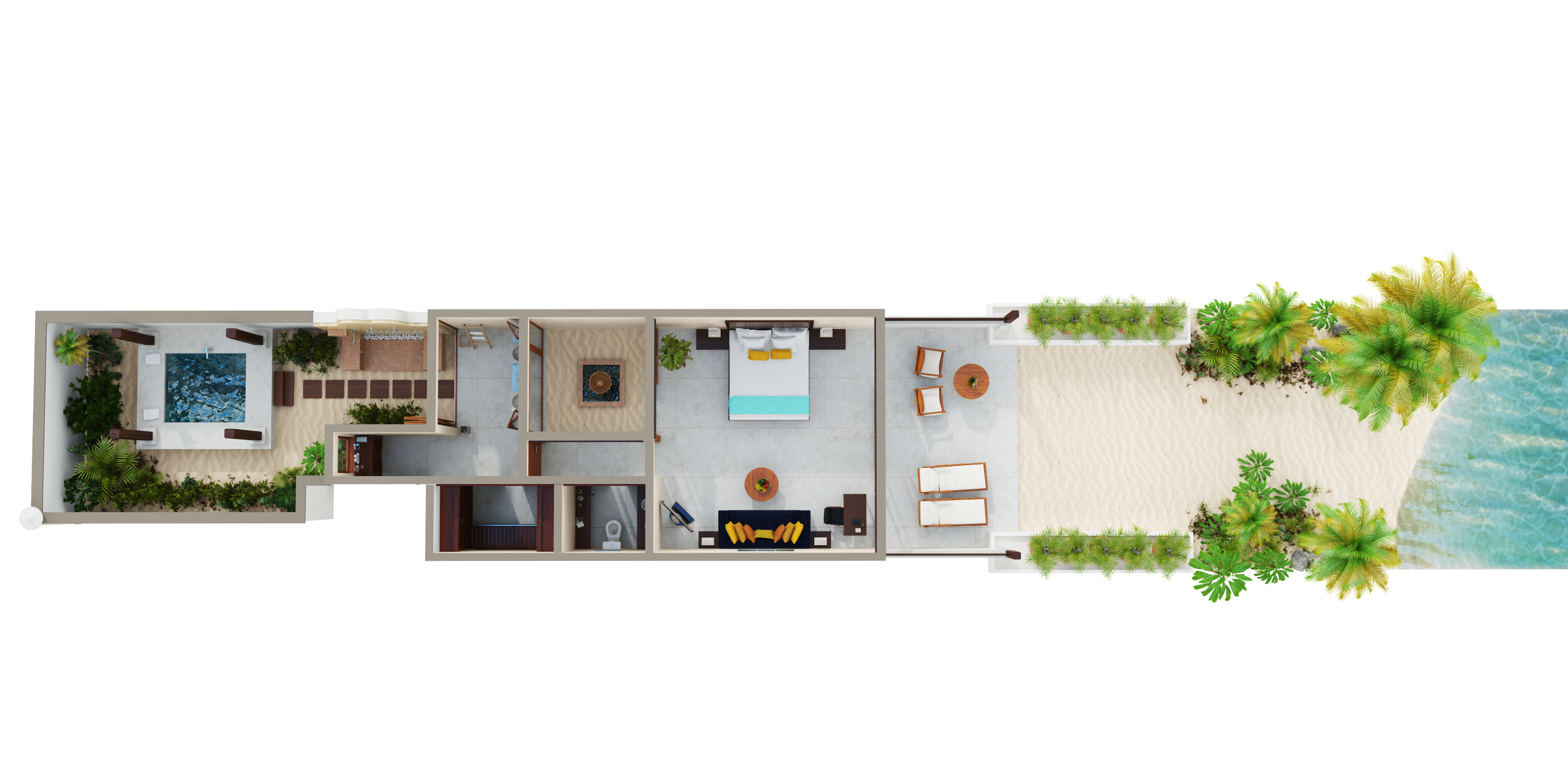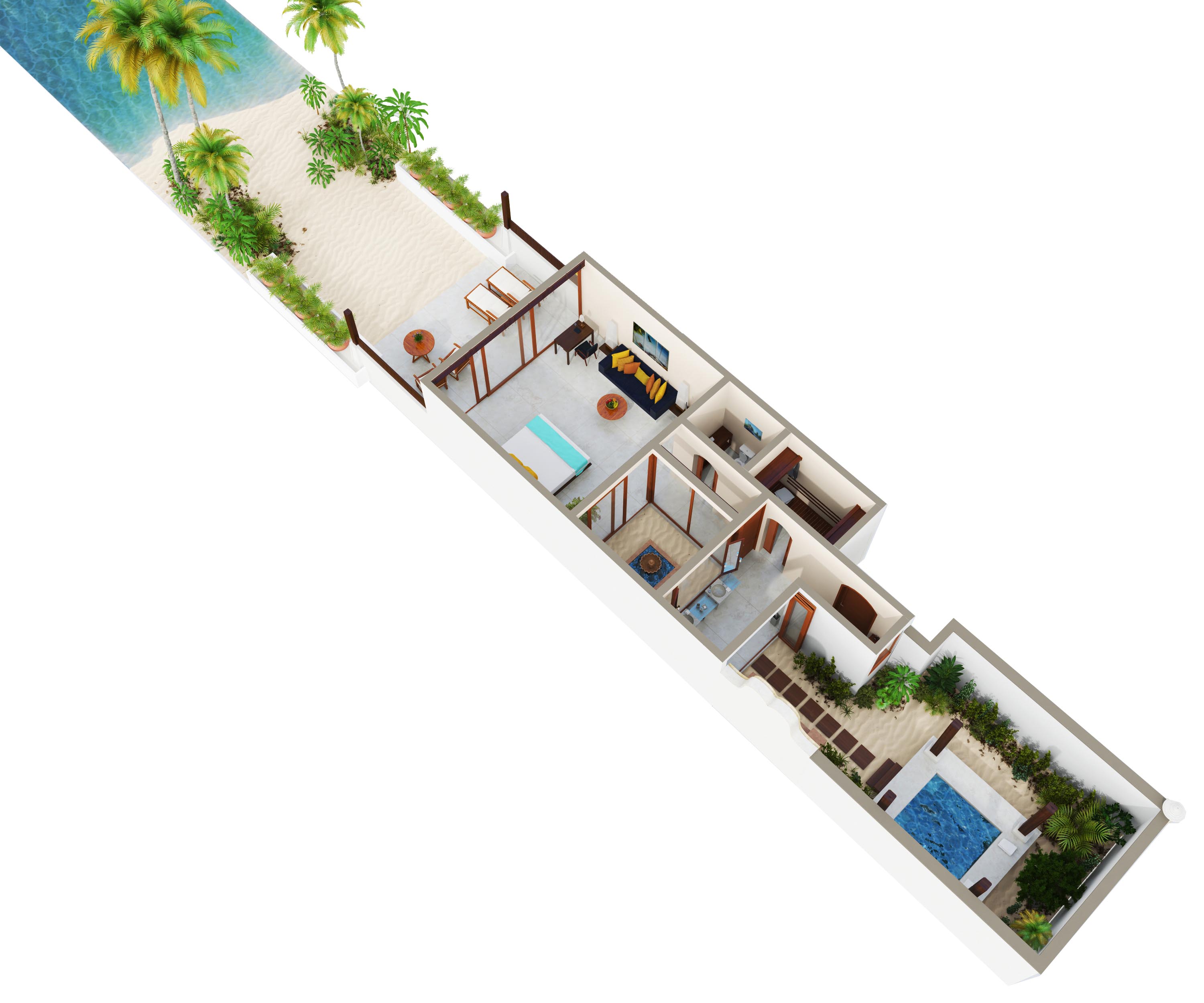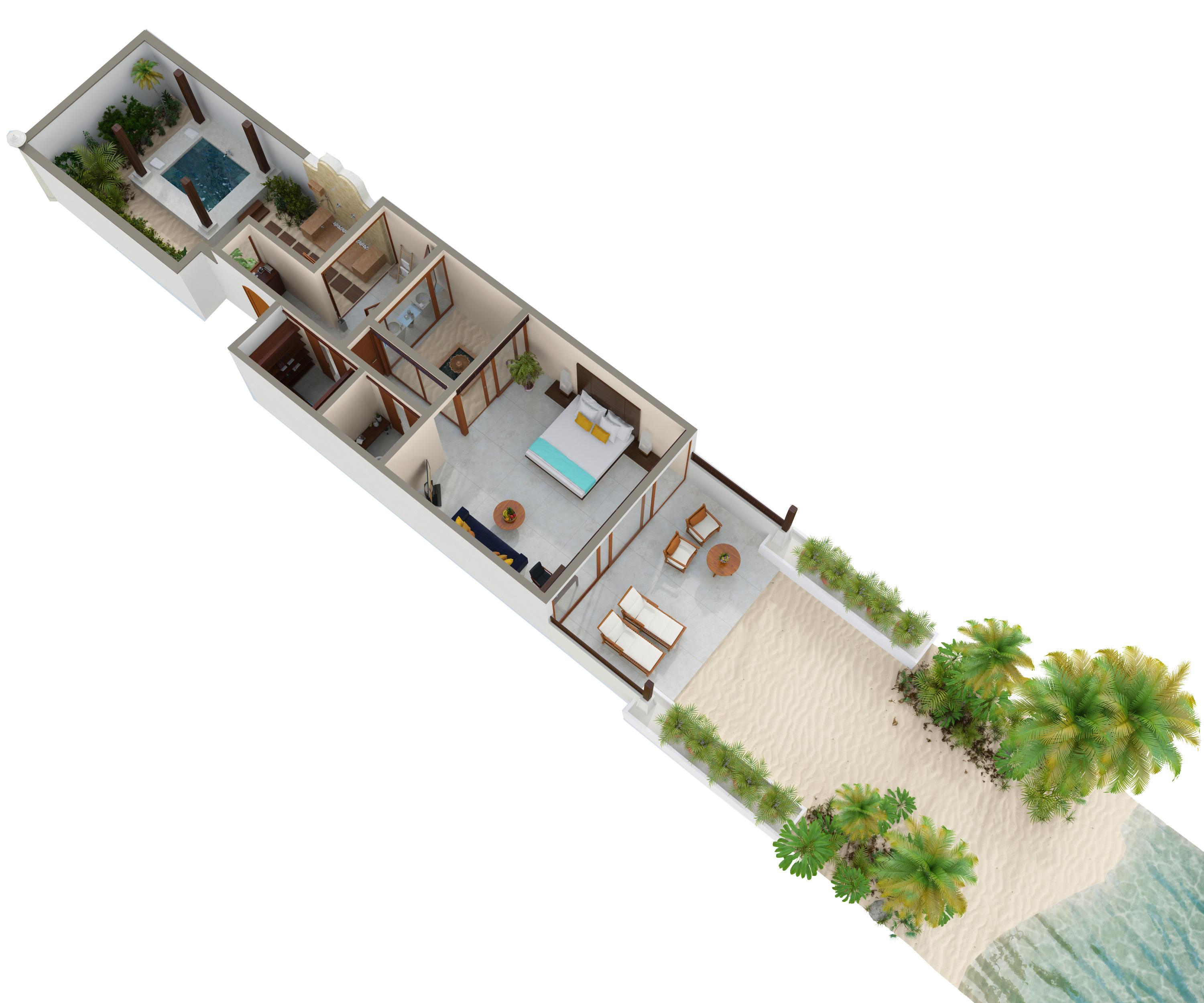 酒店拥有35间位于海滨的沙滩别墅(面积最大达150平米),以玻璃为墙的卧室是一大特色,可直接通往露台与小型私家花园,花园之外可直达海滩。别墅后方是喷泉庭院与露天花园凉亭浴室,以茅草为顶,配有超大浴缸和情景照明系统,处身其中,如梦如幻,浪漫非凡。对于举家旅行或约友共游的宾客来说,11间连通别墅带来了灵活与便利的入住选择。所有别墅的设计都将自然元素与现代设施相结合。