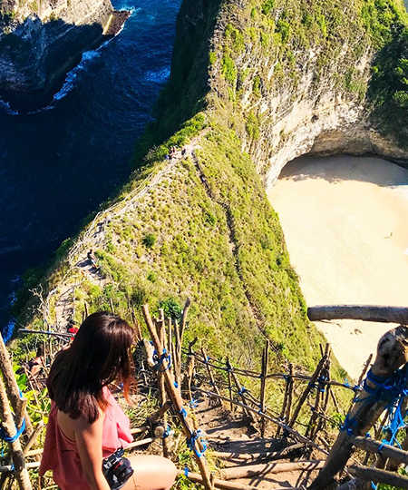 巴厘岛精灵海滩位于佩尼达岛悬崖下,从岛上有专门通往海滩下去的栈道,下到精灵沙滩倒不危险,但是很耗费时间,下去再上来怎么也要两个小时。