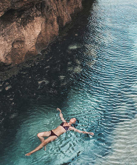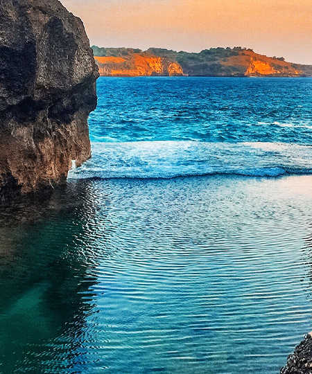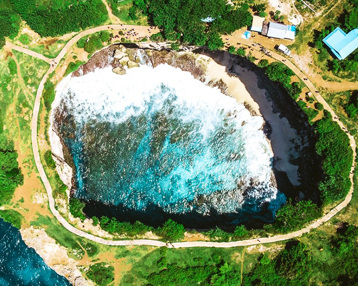 巴厘岛天神浴池在Indonesia,Nusa Penida,天神浴池涨潮时海浪汹涌,最高可达20余米,仅在退潮时才可进入。听从当地人的指引,不要靠近边缘,以免滑落。