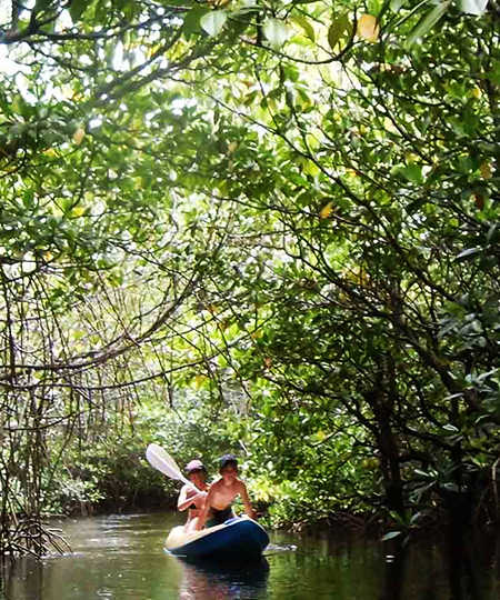 蓝梦岛上有一片很大的红树林,位于岛上的东北部,红树林的入口在岛的最北部。开摩托车到红树林入口处,就能看到很多小船停泊在岸边,选择的时候多问几家比比价。
