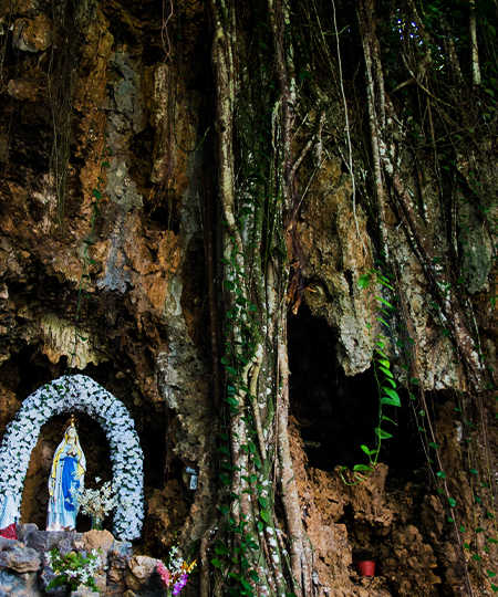 圣母露蒂斯圣地(SantaLourdesShrine)俗称圣母洞,在塞班山顶。塞班90%的人信仰天主教,这里是当地天主教圣地。这里有参天大榕树,山壁上有圣母像,当地人会经常来此进行洗礼、祷告。环境地处
