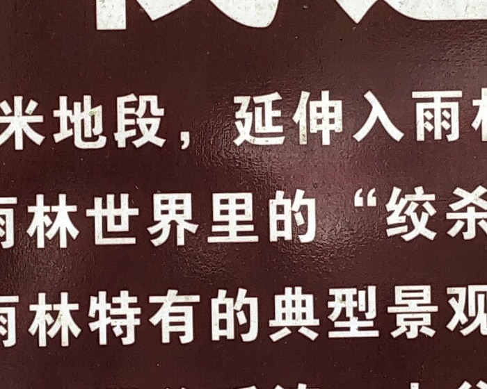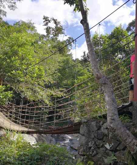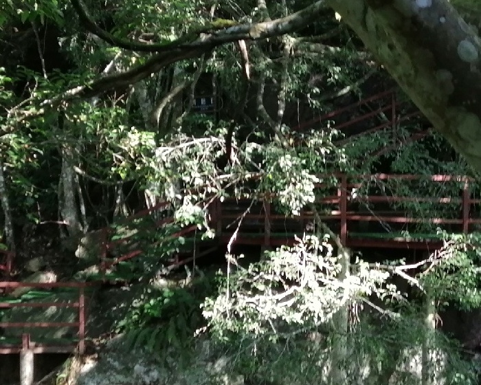 雨林栈道由一块块长条状的木质板材顺山势铺就而成,行走其上,可以感觉得到微微的弹性。 顺着栈道逶迤前行,一路上古树参天,藤萝密布,时常是左眼看淙淙溪水,右眼阅丛丛绿意,抬头看有枝干穿云,俯首时又有苔痕上阶绿。