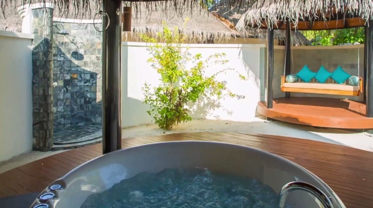别墅位置很隐蔽,打开私人的封闭式庭院,套房的浴室很安静,可以舒服的洗个澡,也能够在甲板上一边观赏泻湖风光,一边享受日光浴。