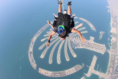 迪拜棕榈岛的高空跳伞运动一直以来都备受欢迎,从4000多公尺的高空一跃而下,整个棕榈岛的美景都在脚下,被蓝色海洋包围着的白色阿拉伯豪宅所组成的独特的棕榈树建筑,是迪拜棕榈岛最大的美景,蓝白之间的相互辉映,令人叹为观止。