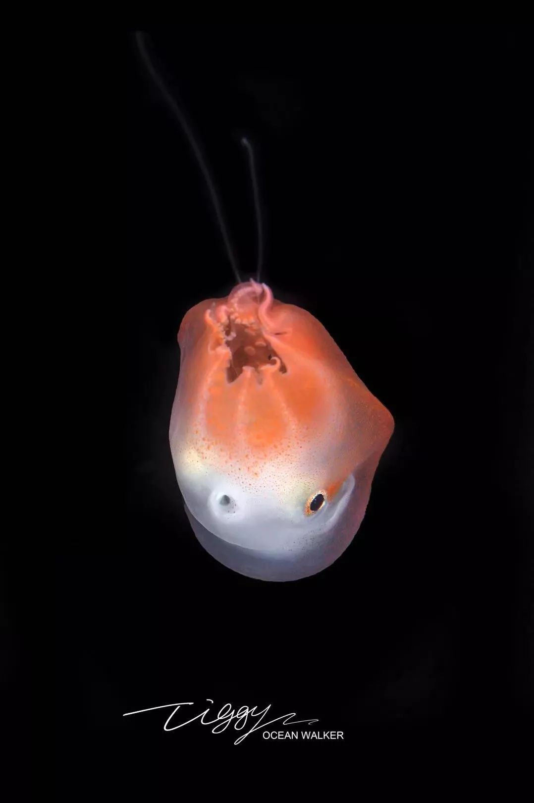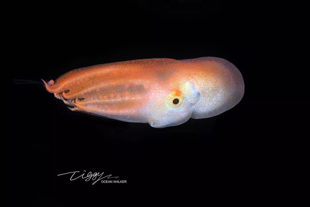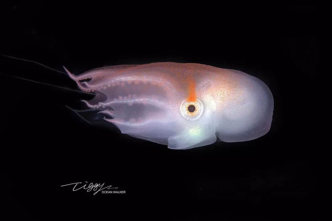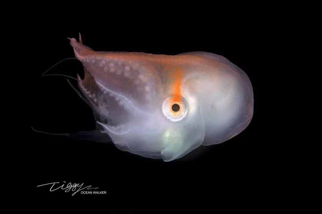 这张照片拍摄于夜间。这些软体动物通常在夜间活动、捕食,所以摄影师会使用灯光来吸引它们(即所谓的“潜黑水”)。我拍摄到这个小家伙时,它正在捕食水母,吃饭的样子很专注,因此我可以通过任何角度来拍摄它——这应该是全世界首次拍摄到七腕章鱼的幼体。我们对深海食物链所知甚少,这次拍摄也证明了水母是深海食物链中必不可少的一环。