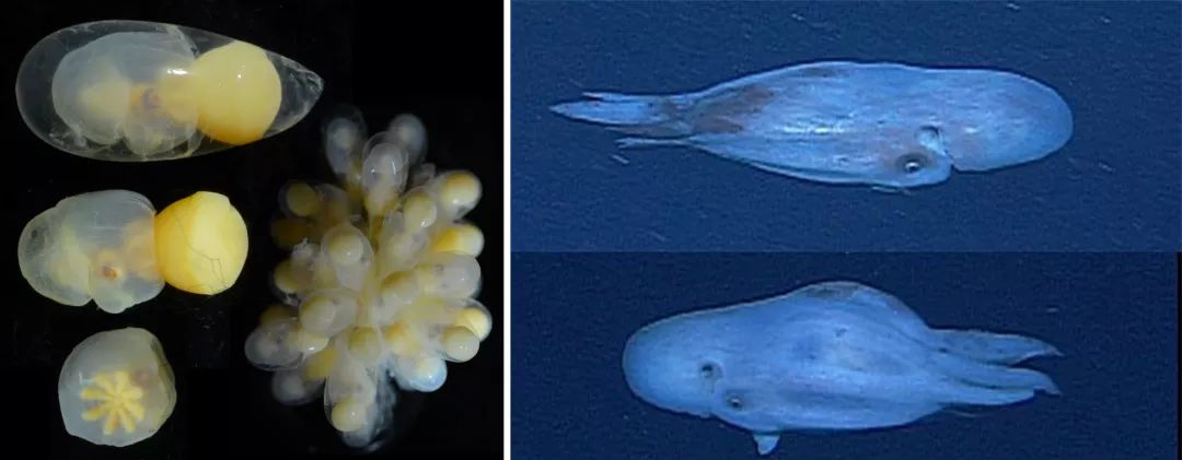 左:七腕章鱼的胚胎与卵;右:研究人员在500米深海域记录到的雌性七腕章鱼(的双视图)。图片:Richard E. Young / Pacific Science(1995);Monterey Bay Aquarium Research Institute