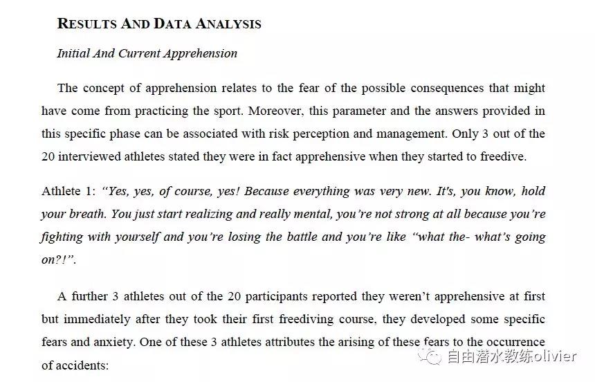 通过在《the psychology of freediving 》一文中的调查数据,我们可以看到,20位受访的初次尝试自由潜水员,有两名受访者在BO中结束了他们的首次潜水,这是由于他们对于海洋,对于未知的事物缺乏足够的敬畏之心。有三名在初次尝试后,对海洋产生了恐惧,但在多年后反复参加这项活动后,随访发现,这三名中的两名受访者,他们不再恐惧和担心,他们从中获得了自信和肯定。第三名受访者的恐惧依旧没有消失,因为他并没有在自由潜水中有更多的进步。由此也说明自由潜水和性格的相互影响作用也需要在反复的潜水训练后,才可能发生。