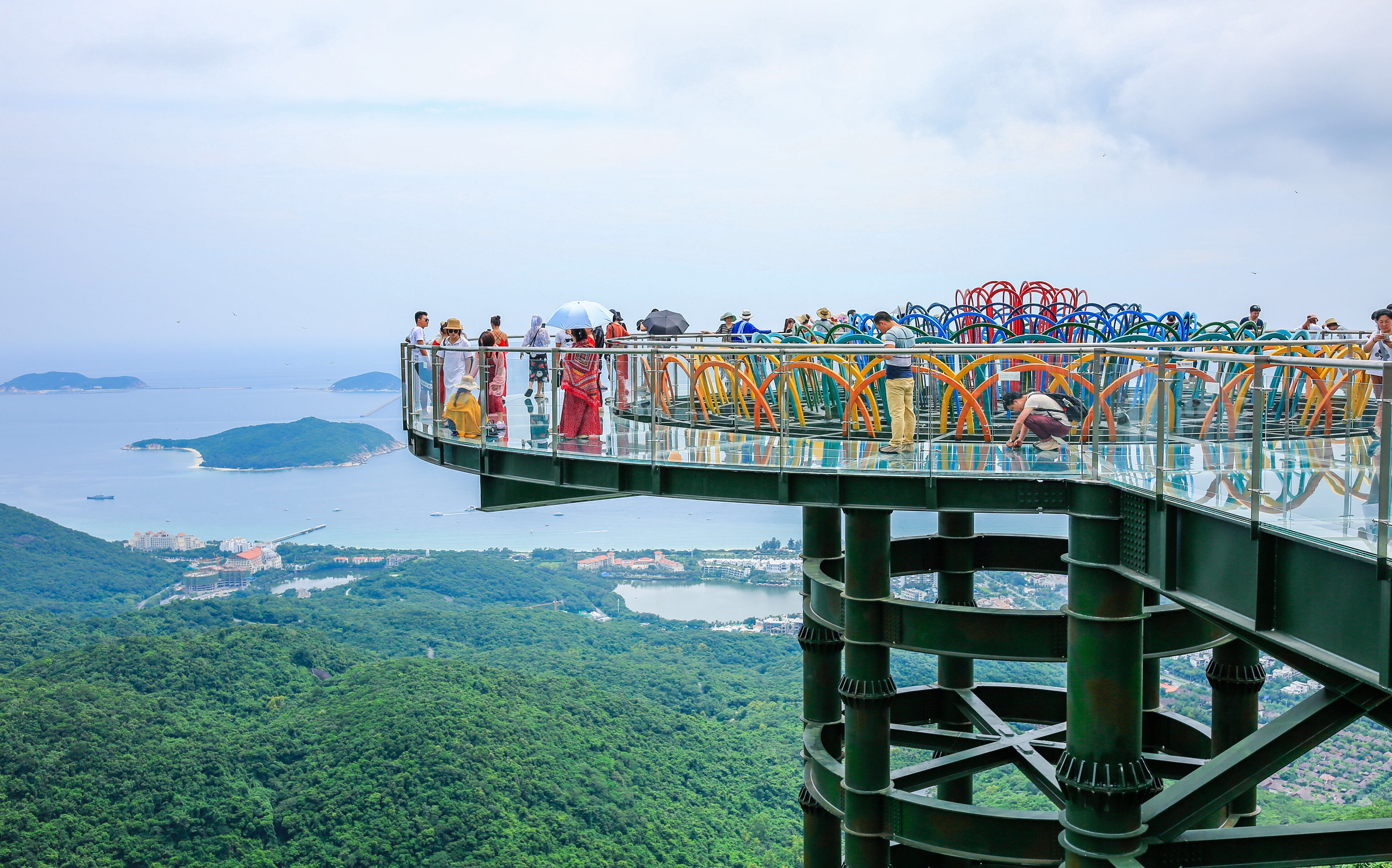 亚龙湾热带天堂森林公园山顶的位置开辟了一条集观赏、体验于一体的全!海!景!玻璃栈道,站在这里的视野让人 feel 君临天下。漫步在玻璃栈道上,不但可以将整片亚龙湾的深蓝尽收眼底,还可以感受清风拂面和脚下雨林簌簌。