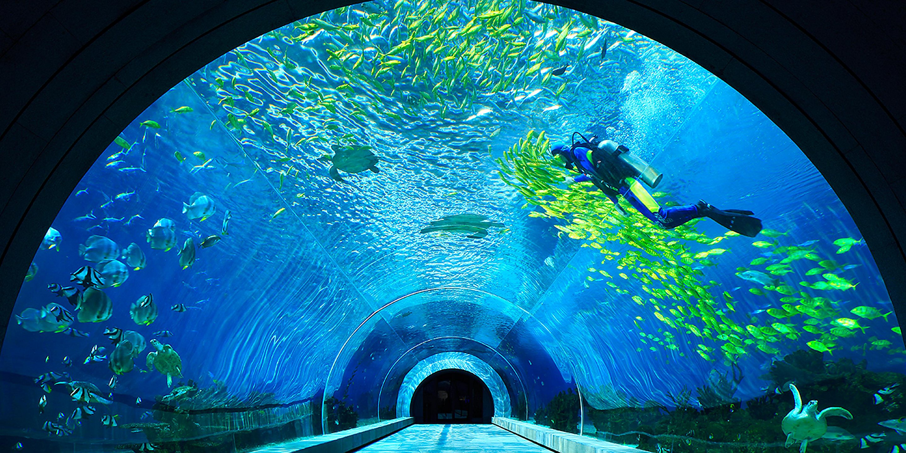 坐在餐厅里就像身处海底隧道一样,特别梦幻。餐厅主要提供特色海鲜和牛扒,还有美味的日式铁板烧,你在享受美食和美酒的同时还能看到漫游在周围的鱼群。