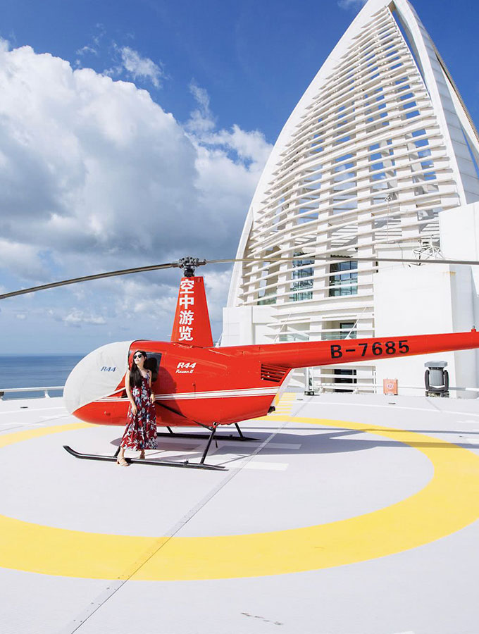 如果你已经打卡完你想去的景点,也体验了三亚大海的魅力,那么你还可以来项刺激的“上天体验”,乘坐直升飞机!你可以近距离的观赏直升机和驾驶舱,也可以和飞行员来个大合照哦。机头的三分之一是透明的,从天上俯瞰三亚椰风海韵的美景,整个视野非常好,一定让你终生难忘!拍出来的照片,让你分分钟制霸朋友圈!